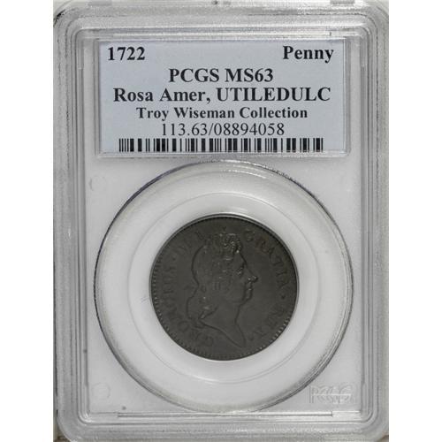 <B>1722 PENNY Rosa Americana Penny, UTILE MS63 Brown PCGS.</B></I> Breen-114. No rosettes in reverse legend. This remarkably smooth Rosa Americana penny has lovely and consistent olive-brown toning. The obverse is double struck with a slight clockwise shift between strikes. The reverse is fully struck with no evidence of doubling. Presumably, the reverse (anvil) die remained fixed while the obverse (hammer) die rotated minutely before the second blow. Listed on page 40 of the 2007 <I>Guide Book.</B></I> Population: 4 in 63, 0 finer (8/06).<BR><I>From The Troy Wiseman Collection, Part Two.</B></I><BR><BR><b>Shipping:</b> Coin/Currency (<a target="_blank" href="http://www.heritageauctions.com/common/shipping.php">view shipping information</a>)
