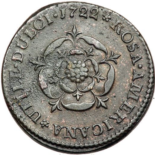 1722 Rosa Americana Penny Breen-116 VF20. Variety with UTILE DULCI. Ten points sharper with areas of fine roughness on both sides. Dark chocolate and steel. Nicely struck and attractive in spite of the imperfect surfaces. See page 40 of the "Redbook." Weight 124.1 grains.