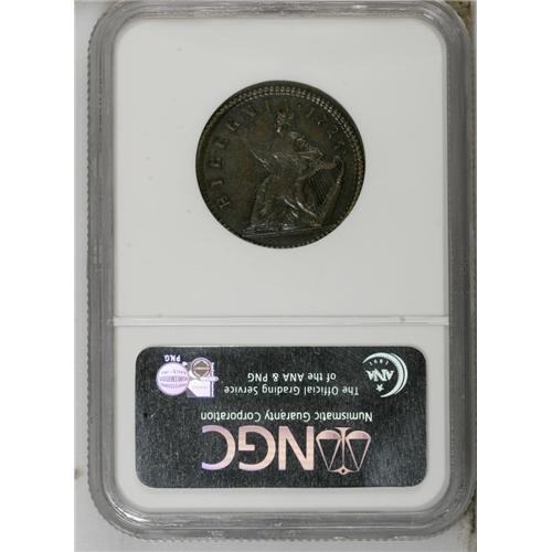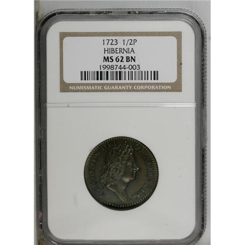 <B>1723 1/2P Hibernia Halfpenny MS62 Brown NGC.</B></I> Nelson-8, Breen-157. Well struck with warm brown surfaces that have olive and violet accents. Die roughness is noted, particularly at the reverse on the seated figure, which makes the attribution speculative; without clarity at the waist, it is impossible to tell if this is a Beaded Cincture piece. Listed on page 43 of the 2007 <I>Guide Book.</B></I><BR><BR><b>Shipping:</b> Coin/Currency (<a target="_blank" href="http://www.heritageauctions.com/common/shipping.php">view shipping information</a>)