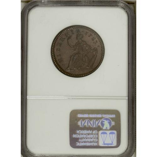 <B>1723 1/2P Hibernia Halfpenny MS64 Brown NGC.</B></I> Unlisted in Breen. Large 3, pellet before H. Breen does not list a Large 3, stop before HIBERNIA variety aside from the overdate. The glossy chocolate-brown surfaces offer traces of red color in protected areas. Sharply struck, but with a few small planchet flaws, as made. Listed on page 43 of the 2007 <I>Guide Book.</B></I><BR><BR><b>Shipping:</b> Coin/Currency (<a target="_blank" href="http://www.heritageauctions.com/common/shipping.php">view shipping information</a>)