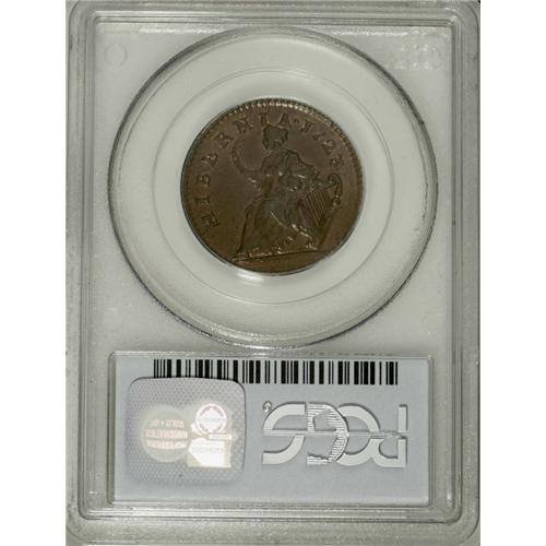 <B>1723 1/2P Hibernia Halfpenny MS64 Brown PCGS.</B></I> No stop before H, Small 3. Breen-159, his "Beaded Cincture" variety with several tiny beads on the waist of the seated effigy. This well struck golden-brown near-Gem displays peripheral glimpses of mint red, and is splendidly free from contact. Listed on page 43 of the 2007 <I>Guide Book.</B></I><BR><BR><b>Shipping:</b> Coins & Currency (<a target="_blank" href="http://www.heritageauctions.com/common/shipping.php">view shipping information</a>)