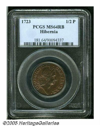 <B>1723<1/2P> Hibernia Halfpenny MS64 Red and Brown PCGS.</B></I> No pellet before H, Small 3. Breen-157. A well struck and splendidly undisturbed Choice Hibernia Halfpenny. Substantial crimson color complements the medium brown toning. Listed on page 24 of the 2004 <I>Guide Book.</B></I>