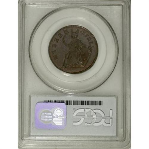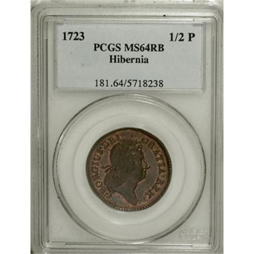 <B>1723 1/2P Hibernia Halfpenny MS64 Red and Brown PCGS.</B></I> Small 3. No pellet before H. Breen-159, the "Beaded Cincture" variety. Red legends and device outlines contrast nicely with medium brown fields. The surfaces are smooth and lustrous, and exhibit an appealing, natural reflectivity. There are a couple of minor marks on the left reverse. Perhaps the most notable aspect of this coin, besides its remarkable eye appeal, is the beaded cincture that appears across the waist of the seated figure on the reverse, opposite the head of the angel on the harp. Five beads are sharp under low magnification. Listed on page 43 of the 2008 <I>Guide Book.<BR>Ex: Long Beach Signature (Heritage, 9/02), lot 5015.</B></I><BR><BR><b>Shipping:</b> Coins & Currency (<a target="_blank" href="http://www.heritageauctions.com/common/shipping.php">view shipping information</a>)