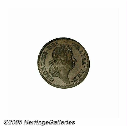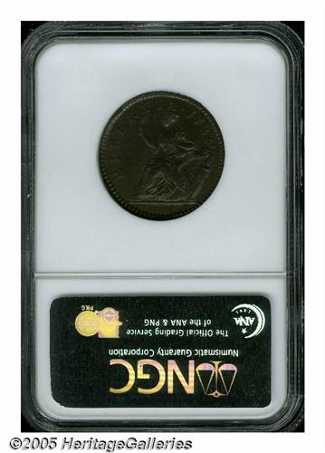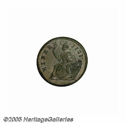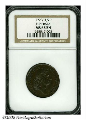 <B>1723<1/2P> Hibernia Halfpenny MS65 Brown NGC.</B></I> Breen-157, No stop before H, small 3 in date. A lustrous deep brown Gem, virtually perfect from a technical perspective. A few tiny planchet flaws, and scattered freckles of die rust, are all strictly as made. NGC does not yet publish their populations for Early American pieces. PCGS has certified 5 pieces as MS65 Brown, 5 pieces as MS65 Red and Brown, and 1 piece as MS66 Red and Brown. Listed on page 30 of the 2005 <I>Guide Book.</B></I>