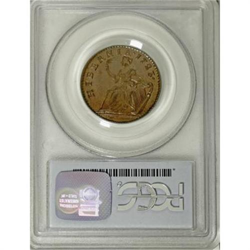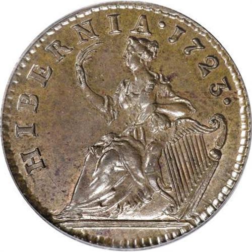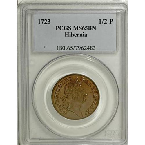 <B>1723 1/2P Hibernia Halfpenny MS65 Brown PCGS.</B></I> Small 3. No pellet before H. Breen-157. A beautiful glossy golden-brown Gem with remarkably smooth surfaces and a penetrating strike. An aesthetic pleasure that will highlight any Early American collection. Listed on page 43 of the 2008 <I>Guide Book</B></I>. Population: 5 in 65 Brown, 0 finer (12/07).<BR><I>From The Liberty Collection of United States Colonial Coinage.</B></I><BR><BR><b>Shipping:</b> Coins & Currency (<a target="_blank" href="http://www.heritageauctions.com/common/shipping.php">view shipping information</a>)