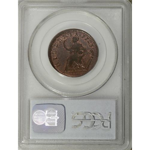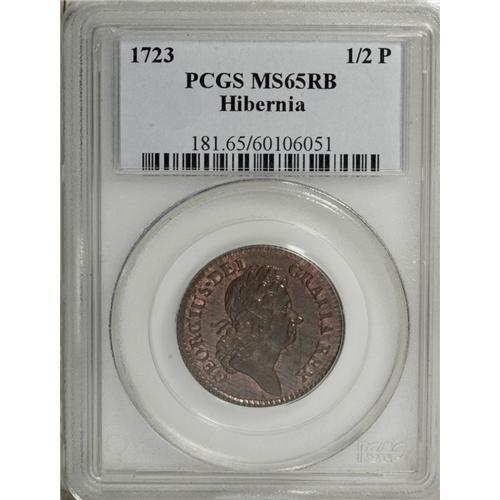 <B>1723 1/2P Hibernia Halfpenny MS65 Red and Brown PCGS.</B></I> Breen-159. No pellet before H, Large 3. Breen's "beaded cincture" variety, with a series of horizontal beads in line with the harp angel's nose. Orange color illuminates the legends and the harp, while the fields offer medium lilac-brown patina. Essentially undisturbed by contact, and the few mint-made planchet streaks are faint and unobtrusive. Listed on page 43 of the 2007 <I>Guide Book.</B></I> Population: 5 in 65 Red and Brown, 1 finer (11/06).<BR><BR><b>Shipping:</b> Coin/Currency (<a target="_blank" href="http://www.heritageauctions.com/common/shipping.php">view shipping information</a>)
