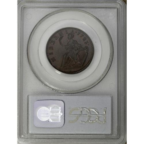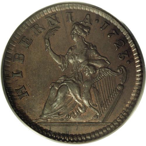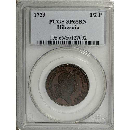 <B>1723 1/2P Hibernia Specimen Halfpenny SP65 Brown PCGS.</B></I> No stop before H, stop after date. Breen-157. 8.07 grams. Intricately detailed with rich crimson and burnt-gold coloration over smooth, glossy surfaces. Rare as a proof striking, with only a handful of auction appearances over the last quarter century. The Roper Collection specimen realized $3,630 in 1983. Listed on page 42 of the 2007 <I>Guide Book.</B></I><BR><BR><b>Shipping:</b> Coin/Currency (<a target="_blank" href="http://www.heritageauctions.com/common/shipping.php">view shipping information</a>)