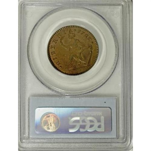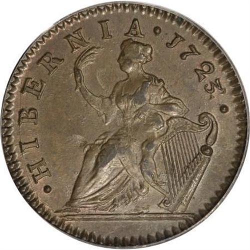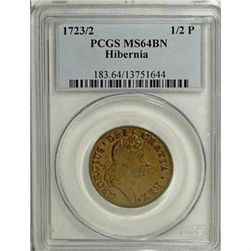 <B>1723/2 1/2P Hibernia Halfpenny MS64 Brown PCGS.</B></I> Small 3. Pellet before H. Breen-153. This bold overdate shows the curve and base of a 2 to the right of the 3. The surfaces are wonderfully glossy chocolate-brown and retain considerable portions of faded mint red. A pair of mint-made strike-throughs are noted near the seated effigy. Listed on page 43 of the 2008 <I>Guide Book.</B></I> Population: 1 in 64 Brown, 0 finer (12/07).<BR><I>From The Liberty Collection of United States Colonial Coinage.</B></I><BR><BR><b>Shipping:</b> Coins & Currency (<a target="_blank" href="http://www.heritageauctions.com/common/shipping.php">view shipping information</a>)