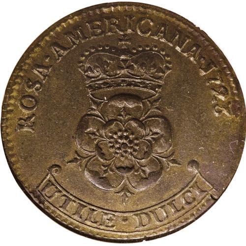 <B>1723<2PENCE> Rosa Americana Twopence MS61 Brown NGC.</B></I> Breen-96. A lovely medium brown representative of this William Wood import. The strike on the major devices is impressive, and the surfaces are unusually unabraded. A tiny planchet crack shows at the reverse rim at 4 o'clock, and small granular areas are noted on the obverse at 6:30 and beneath the chin. Listed on page 41 of the 2007 <I>Guide Book.</B></I><BR><I>Ex: Lorin G. Parmelee Collection (New York Coin & Stamp, 6/1890), lot 539; John G. Mills Collection (S.H. & H. Chapman, 4/1904), lot 80; F.C.C. Boyd; John J. Ford, Jr. Collection, Part IX (Stack's, 5/05), lot 158, which realized $2,185.</B></I>