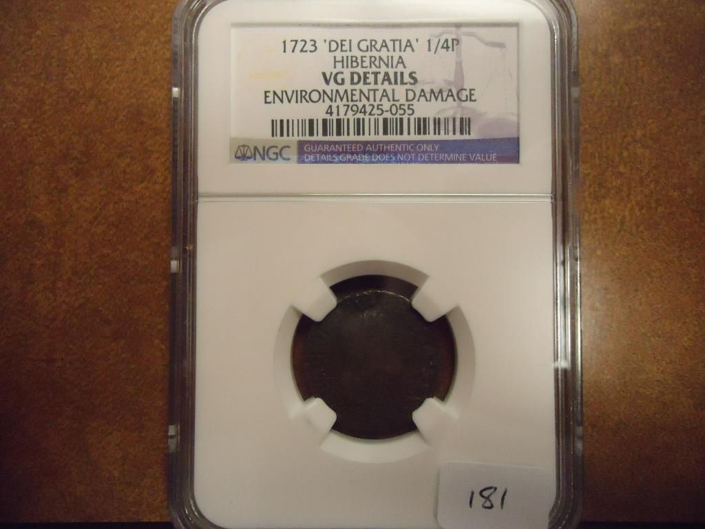 1723 "DEI GRATIA" 1/4 PENNY HIBERNIA NGC VG DETAIL