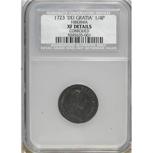 <B>1723 FARTH Hibernia Farthing, D:G:REX--Corroded--NCS. XF Details.</B></I> NGC Census: (0/0). PCGS Population (1/35). (#173)<BR><BR><b>Shipping:</b> Coins & Currency (<a target="_blank" href="http://www.heritageauctions.com/common/shipping.php">view shipping information</a>)