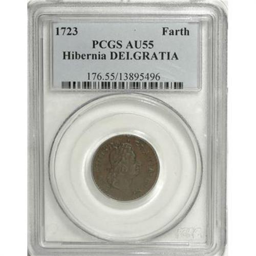 <B>1723 FARTH Hibernia Farthing, DEI GRATIA AU55 PCGS.</B></I> PCGS Population (20/82). NGC Census: (0/0). (#176)<BR><BR><b>Shipping:</b> Coins & Currency (<a target="_blank" href="http://www.heritageauctions.com/common/shipping.php">view shipping information</a>)