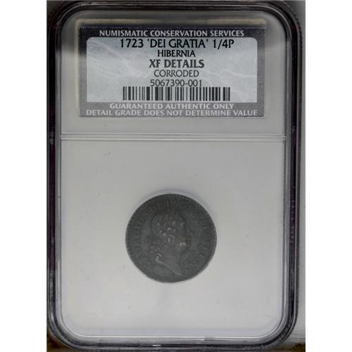 <B>1723<FARTH> Hibernia Farthing, DEI GRATIA--Corroded--NCS. XF Details.</B></I> Breen-172. Close DEI GRATIA. The king's portrait is bold, but the dark lavender surfaces exhibit blue-green verdigris. The reverse has been tooled to remove the corrosion, and has a scraped and pitted appearance. Listed on page 42 of the 2007 <I>Guide Book.</B></I>
