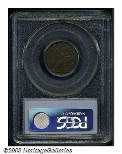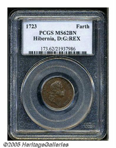 <B>1723<FARTH> Hibernia Farthing, DEI GRATIA MS62 Brown PCGS.</B></I> Breen-170, "Very Rare." Breen's "Second Prototype Farthing" with DEI and GRATIA widely spaced. Scarcer than the usually encountered Breen-172. Incorrectly designated as a D:G:REX variety on the PCGS insert. A bold golden-brown example with shimmering luster and clean surfaces. Listed on page 29 of the 2005 <I>Guide Book.</B></I>