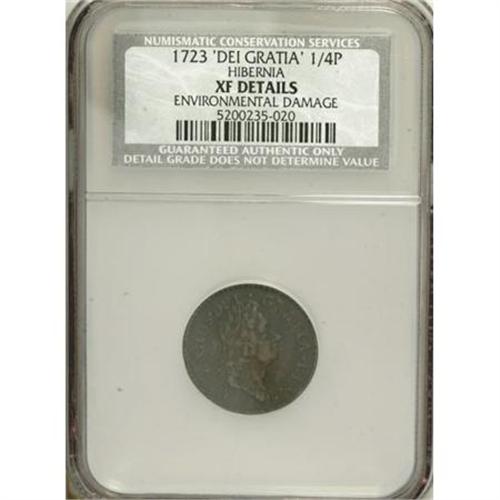 <B>1723 FARTH Hibernia Farthing, DEI GRATIA--Environmental Damage--NCS. XF Details.</B></I> NGC Census: (0/0). PCGS Population (13/143). (#176)<BR><BR><b>Shipping:</b> Coins & Currency (<a target="_blank" href="http://www.heritageauctions.com/common/shipping.php">view shipping information</a>)