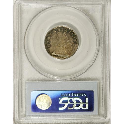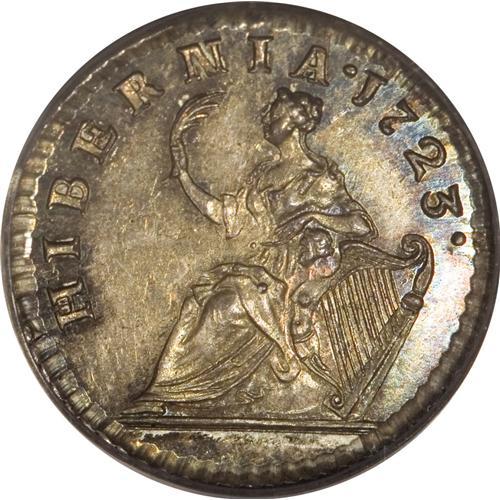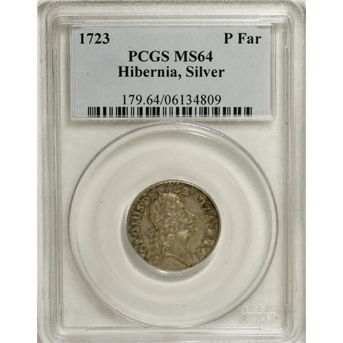 <B>1723 FARTH Hibernia Pattern Farthing, Silver MS64 PCGS.</B></I> Breen-173, "very rare." Close DEI GRATIA. According to Breen, "About 20 pieces turned up in England, 1971," a quantity insufficient to satisfy the growing number of Early American collectors. Lovely orange-gold and ocean-blue endow this prooflike and needle-sharp Hibernia pattern. A small planchet flaw (as struck) in the field near the chin and a tiny roundish depression on the King's cheek are mentioned for the sake of future pedigree researchers. Listed on page 42 of the 2007 <I>Guide Book.</B></I> Population: 2 in 64, 3 finer (2/07).<BR><BR><b>Shipping:</b> Coins & Currency (<a target="_blank" href="http://www.heritageauctions.com/common/shipping.php">view shipping information</a>)