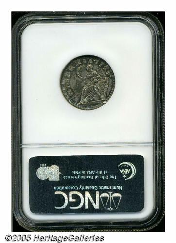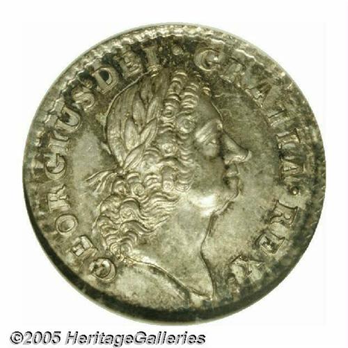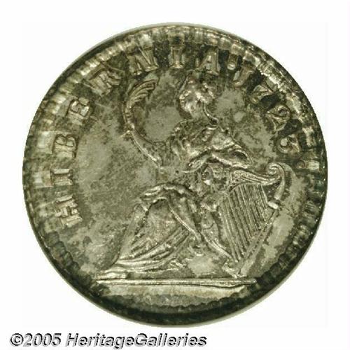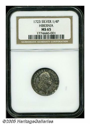 <B>1723<FARTH> Hibernia Pattern Farthing, Silver MS65 NGC.</B></I> Silver. Breen-151, Nelson-7. Only three MS65 examples have been certified of this rare issue, two by PCGS and this single piece by NGC, which was formerly one of the PCGS coins. The patent for striking halfpence and farthings for Ireland is a subject fraught with much political intrigue in the court of King George I. William Wood, the owner of several copper and tin mines in the West Country area of England, obtained a royal patent from King George I dated June 16, 1722 that authorized him to strike copper halfpence and farthings for Ireland. After years of political haggling and intrigue, Wood resigned his patent in 1725 and royal authorities withdrew the coinage from Ireland in 1737. However, the luckless Hibernia coinage received a new lease on life when English profiteers purchased the currency at bullion value and shipped it to the American colonies. Alongside Wood's Rosa American coinage, the Hibernia coppers joined the family of American colonial issues and remained in circulation here until shortly before the outbreak of the Revolution.<BR> This presentation farthing was struck in silver and, while Breen does not speculate on the number of coins produced, he does classify the issue as "extremely rare." Similar in appearance (but definitely not the same coin) to the 1999 piece, this farthing also shows scattered deep gray and blue toning with light gray patina over each side. Bright mint luster underlies the mottled toning with no obvious abrasions on either side. The often-seen die break is readily evident below King George's bust. Missing from the Garrett Collection and, in fact, missing from many advanced collections of Colonial coins, this is a rarely offered opportunity to acquire this rare silver farthing. Listed on page 29 of the 2005 <I>Guide Book.</B></I>