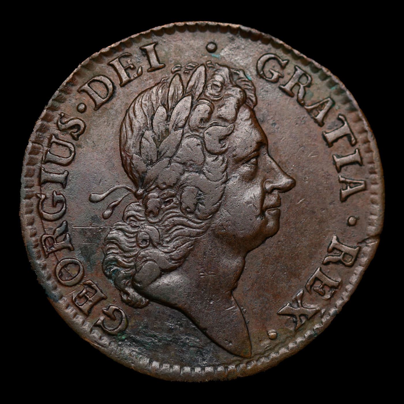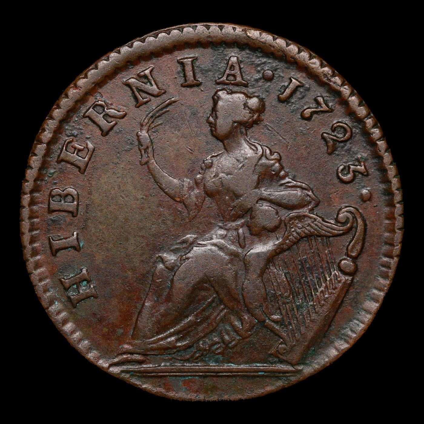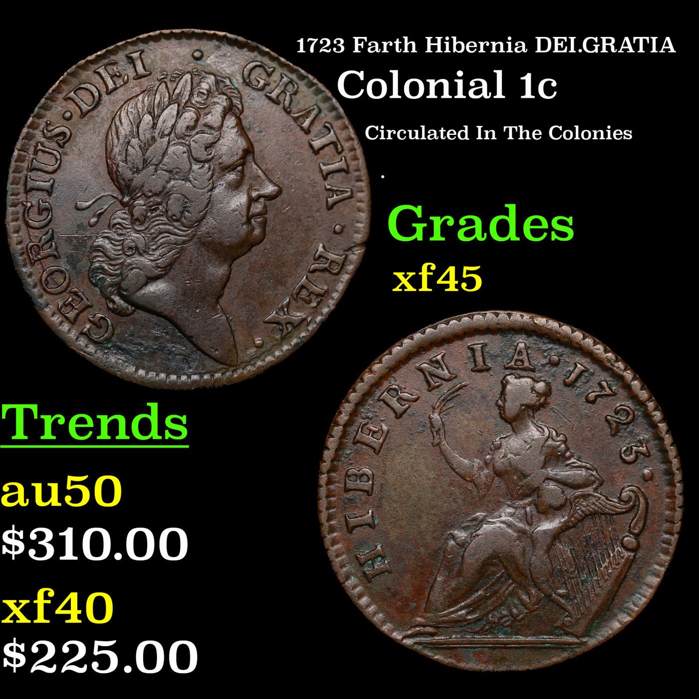 1723 Farth Hibernia DEI.GRATIA Colonial Cent 1c Grades xf+. William Wood, owner of several copper and tin mines, hoped to make a profit producing coins for use in Ireland and America. During the first half of 1722 the king's mistress, the Duchess of Kendal, obtained a patent from the Earl of Sunderland for coining copper money for Ireland. Wood thought this would be a profitable enterprise so he purchased the royal patent from the duchess for £10,000. In his indenture from George I dated June 16, 1722 Wood was authorized to produce up to 360 tons of halfpence and farthings for Ireland at 30 pence to the pound over a period of fourteen years for an annual fee of £800 paid to the king. These Hibernia coins were heavier and thus intrinsically more valuable than the coppers then circulating in Ireland. They were certainly less profitable for Wood to mint than his lighter weight Rosa Americana issues. (Hibernia's weighed sixty halfpence to the pound as compared to 120 Rosa Americana halfpence to the pound!). When including the costs of production and the £10,000 fee paid to the Duchess of Kendal, Mossman has calculated Wood would have lost £4,871 over the fourteen years of the patent. Thus from Wood's standpoint the Hibernia coin specifications were too generous based on the cost of production.It has generally been held that the Irish did not accept the Hibernia coppers. However, Danforth has recently suggested that the coins were accepted at first but over time the Irish regected the coins. Danforth believes the coins continued in use until 1737 when they were replaced by regal Irish coppers. Others have suggested the Irish refused to use the coinage on nationalistic grounds and that they relied on other coppers (which included the Saint Patrick coppers). What they needed was silver coinage of sixpence, shillings, half crowns and crowns, which the English were not willing to export. Jonathan Swift led the Irish attack on the English coinage in his publication of The Drapier's Letter in which he accused Wood of profiteering. The protests of Swift and other Irish intellectuals is usually taken as the reason that Wood quit the project within three years; very few Wood's Hibernias have been uncovered in Ireland.