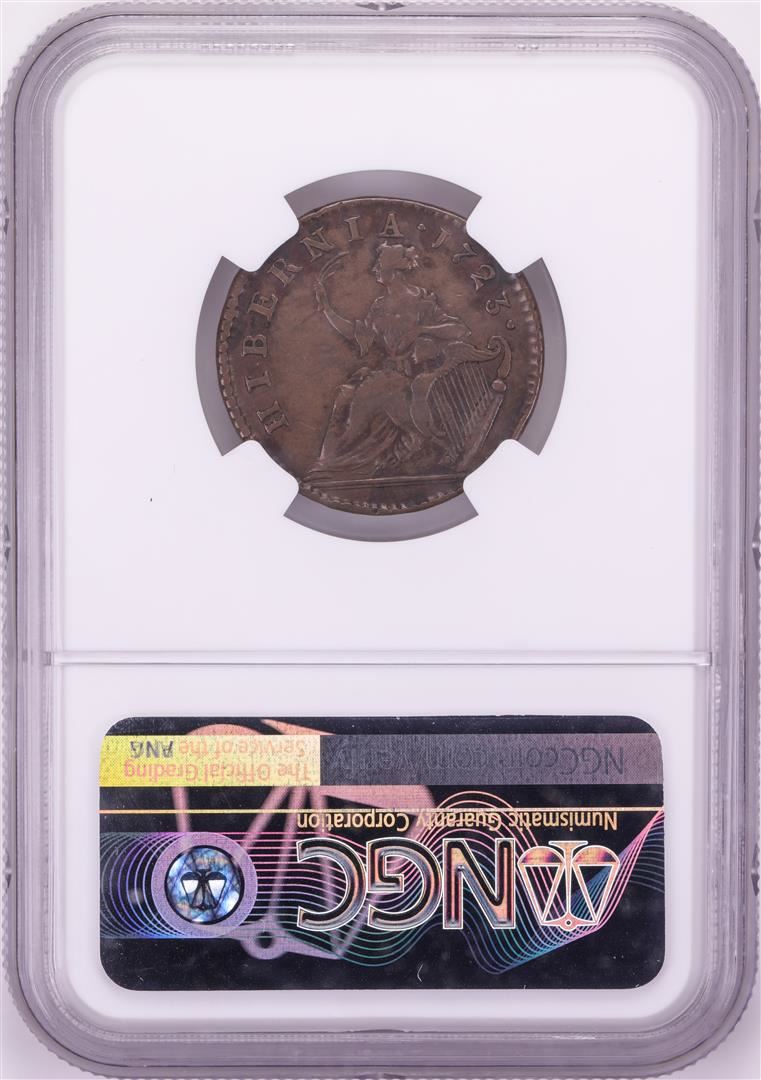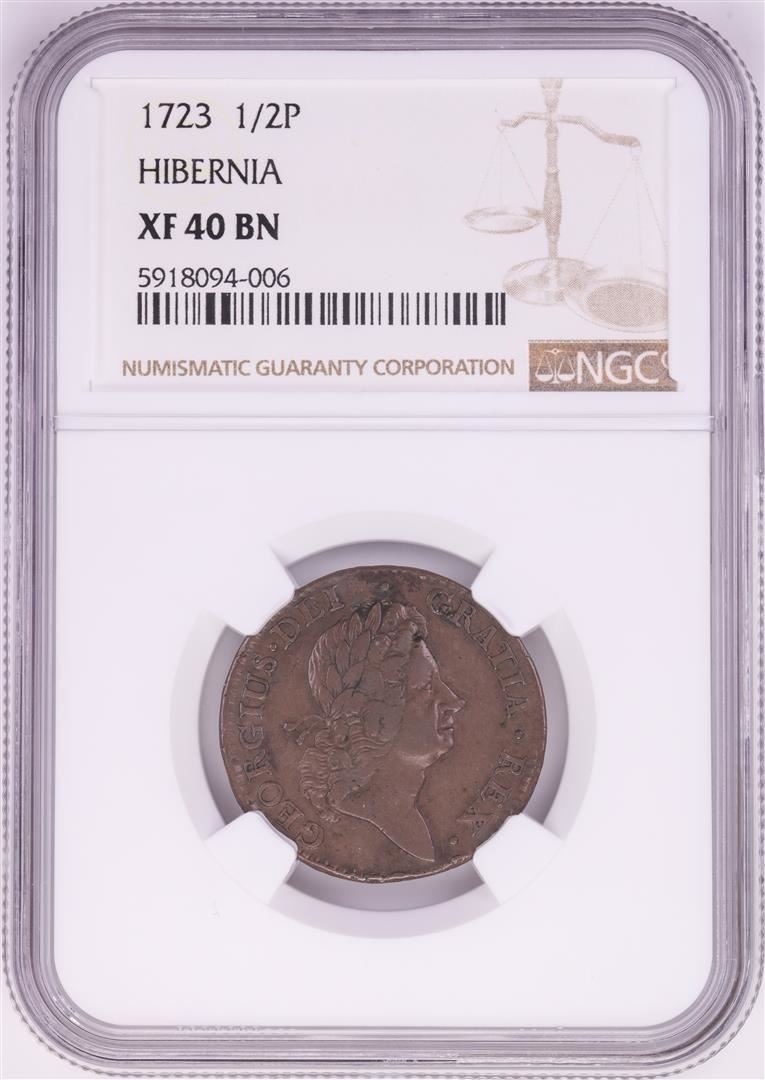 One 1723 Half Penny Hibernia Colonial Copper Coin NGC XF40BN. NGC Certified.