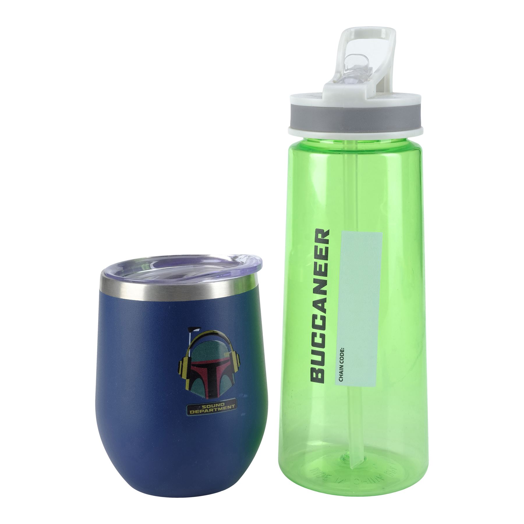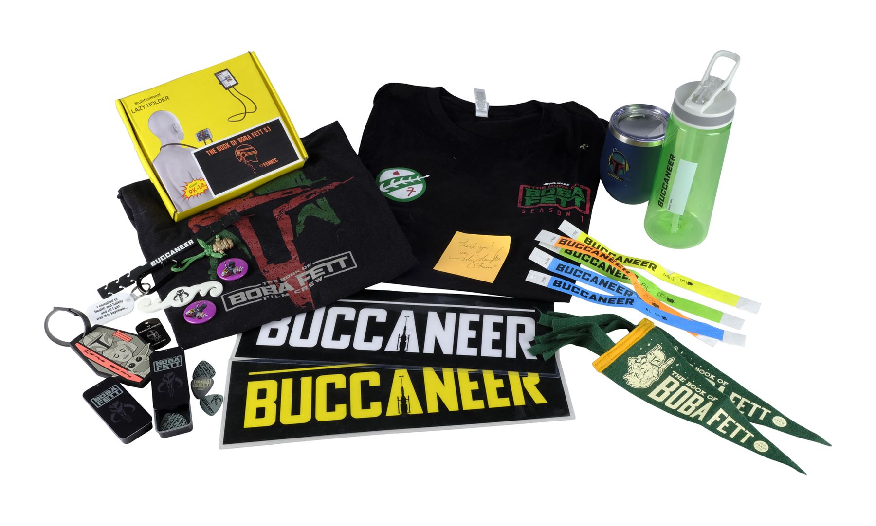 This set consists of a multifunctional "lazy holder" inside its original box, which is affixed with a production logo labeled "[Heart] Fennec" for Wen's character Fennec Shand; a sticky note handwritten in ink and signed "Thank you! XO 'Fennec'" by Wen; a 12 oz. matte blue metal Cece tumbler labeled for the Fett Sound Department; a green plastic canteen labeled "Buccaneer," Fett's production code name; two plastic-laminated "Buccaneer" parking placards; six "Buccaneer" wristbands; two green and yellow Fett Oxford pennants; a black cotton Fett T-shirt (size L) labeled for the Fixtures Department; a heather gray cotton Fett T-shirt (unsized) labeled for the Set Lighting Department; two metal pins printed with illustrations of Fett (Temuera Morrison); two black Fett tins containing Fett guitar picks; a metal Mandalorian keychain with a Grogu lanyard and a tag featuring a Mandalorian wearing personal protective equipment; a black rubber Mandalorian luggage tag; and a Mandlorian S2 tag with a note from the Makeup Department. The black shirt exhibits staining from wear. Dimensions: (largest) 12" x 7" x 2" (30.5 cm x 18 cm x 5 cm)