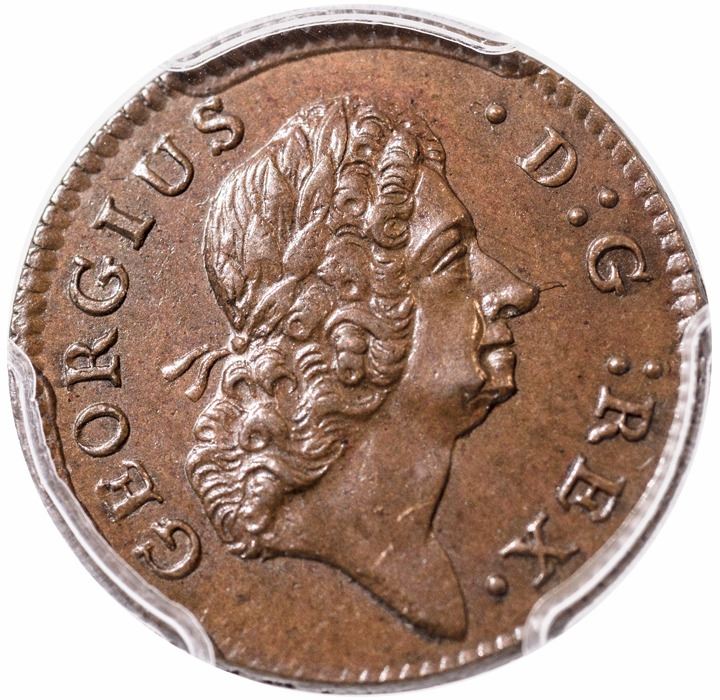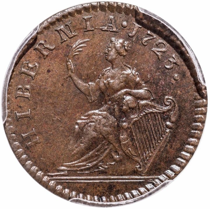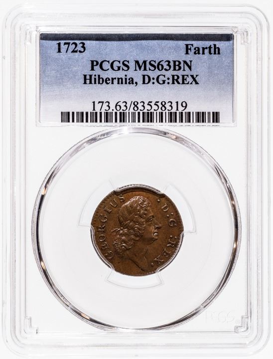 1723 Wood's Hibernia Farthing. “D:G: REX.” Type. 11 Harp Strings. Whitman-12240. PCGS graded Mint Sate-63 Brown.