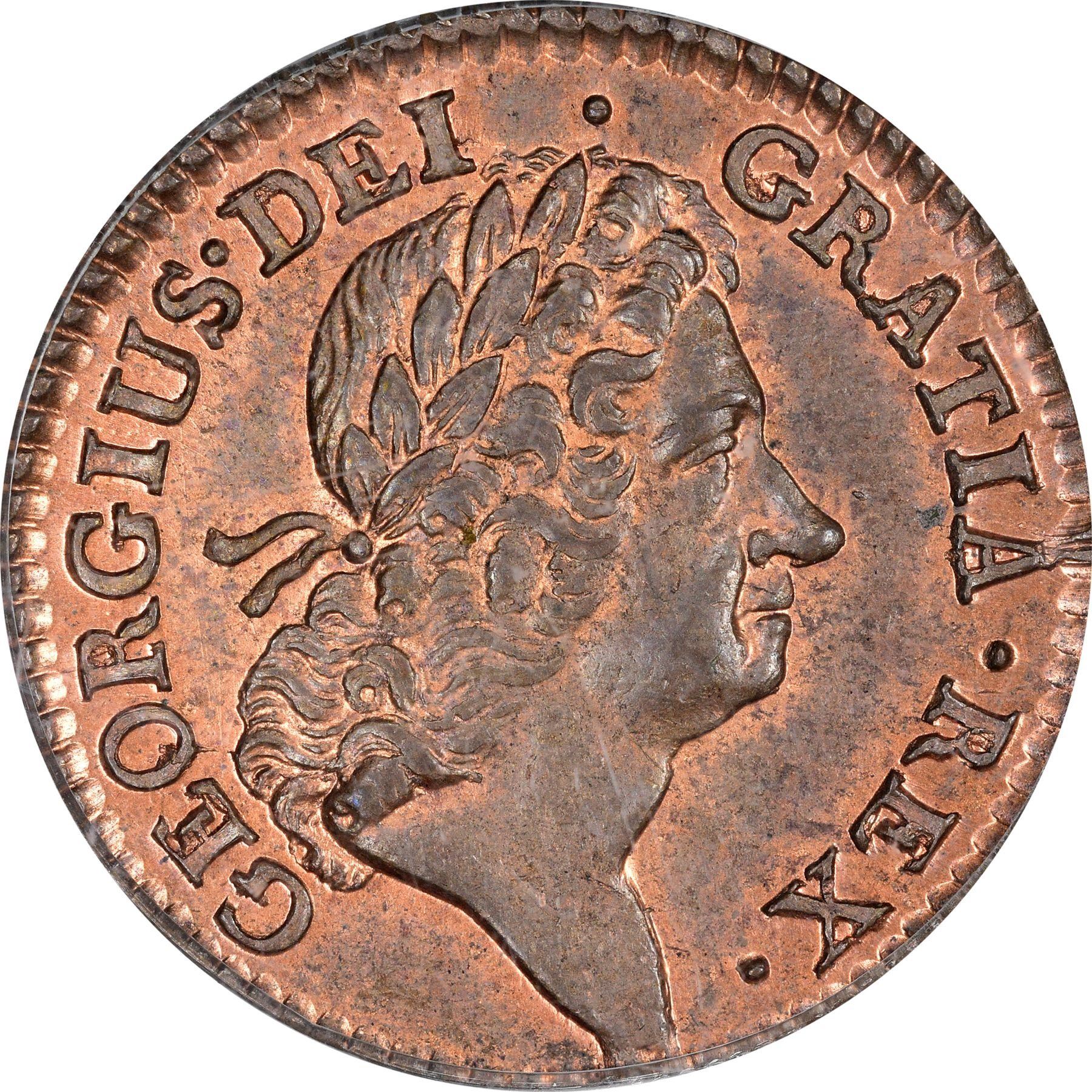 Description: The warm golden-tan surfaces of this widely adopted Irish halfpenny issue display an abundance of lively mint red brightness, especially so in the protected design areas. The strike is fairly crisp throughout except at Hibernia’s waist area on the reverse, as is somewhat typical for the issue. As with most examples of the issue, the dies here provided a scenario of clash marks, graver’s slips, and crumbling at the lettering. The Hibernia coinages, especially the halfpennies dated 1723, are among the few colonial-era coinages that are not overly difficult to obtain in AU or better grades – all that’s needed is a great deal of patience or for the old “right time, right place” axiom to fall into place. However, if Gem quality is a factor on your personal want list, the pickings become increasingly thin, even for this somewhat available type. Competition will be tough as like-minded bidders gather to take home this prize. Housed in an older-style green label PCGS holder with plastic frame.