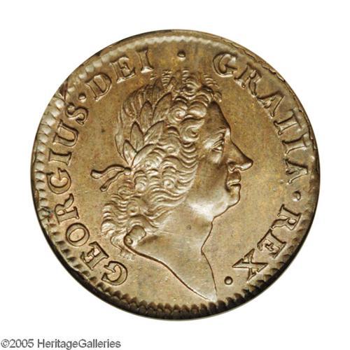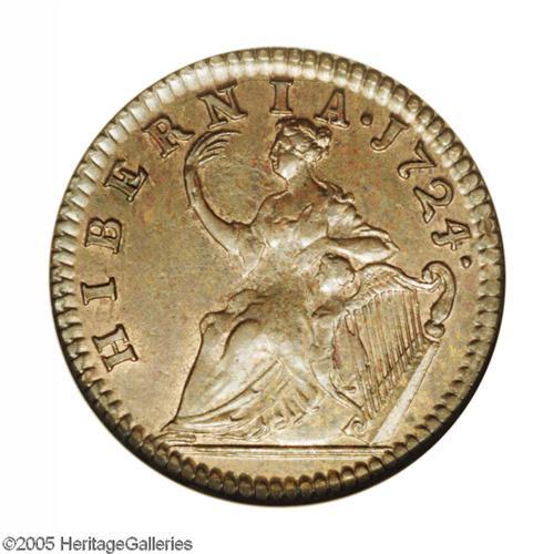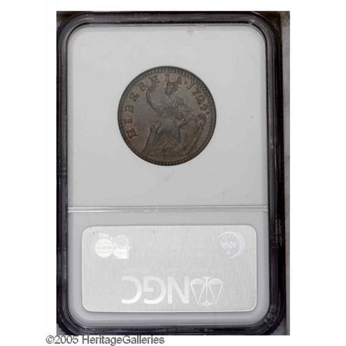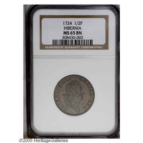 <B>1724<1/2P> Hibernia Halfpenny MS65 Brown NGC.</B></I> Breen-166. The 1723 Halfpenny is the usually encountered Hibernia issue. The 1724 is considerably more difficult, and is rarely found with the quality of the present unabraded Gem. Golden-brown fields cede to glimpses of original Red within the legends and devices. Crisply although not fully struck, minor mint-made planchet flaws (in the field near the chin on the reverse and along the obverse edge are all that limit the grade. As of (10/05), NGC has certified only 5 examples of the 1724 Halfpenny. Three are in VF grades, one is certified AU53, and the present Gem grades 12 points finer as MS65 Brown. Of note to variety collectors of the Hibernia series, HIBERNIA and DEI GRATIA are widely spaced, and a stop is present after the 4 in the date. The E in REX is recut east, and the final A in HIBERNIA is centered slightly right of the hair bun. Listed on page 43 of the 2006 <I>Guide Book.</B></I>