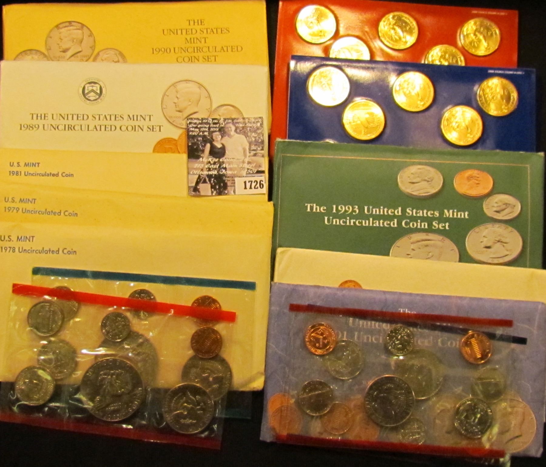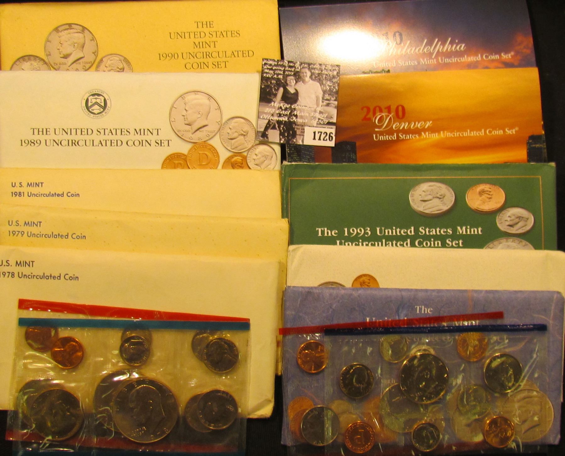 1726 . 1978, 79, 81, 89, 90, 91, 92, 93, & 2010 U.S. Mint Sets, all original as issued. (Total of $3