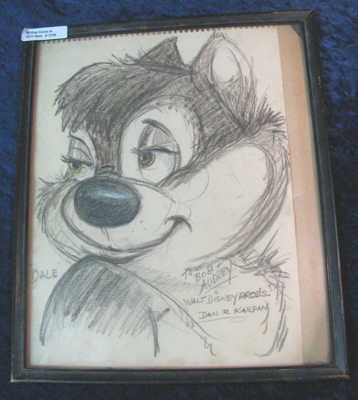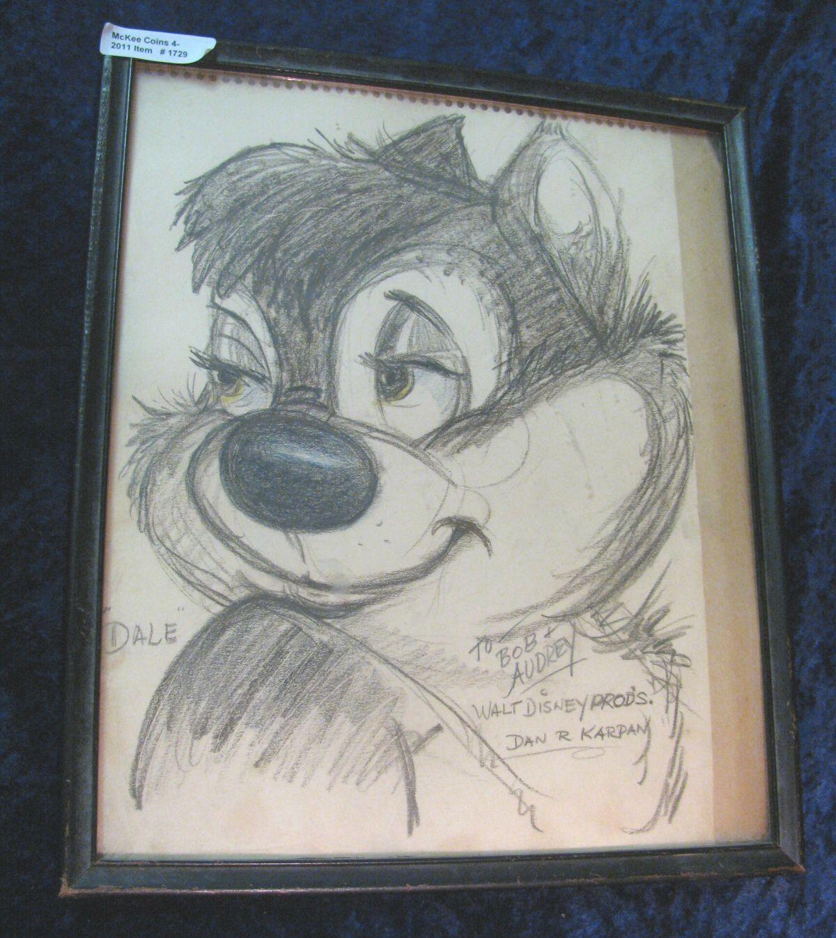1729. Original Walt Disney Productions Sketching of "Dale" by World renown Disney Artist "Dan R. Karpan", whom happened to live in Albia, Iowa. Autographed to "Bob & Audrey". Framed.