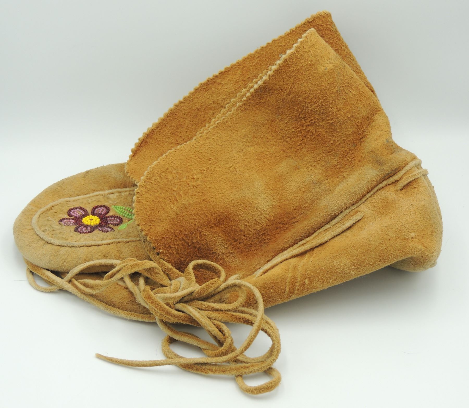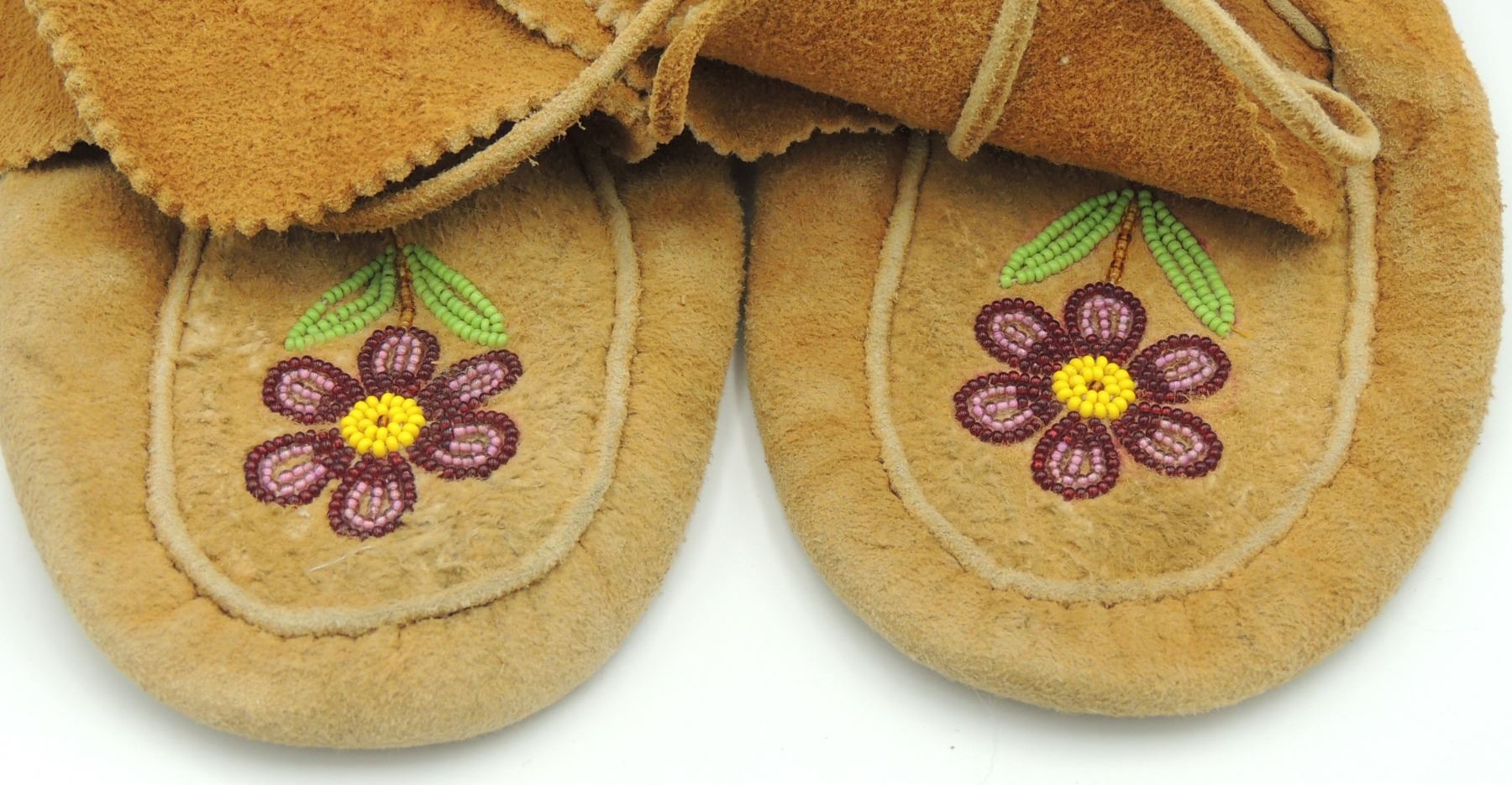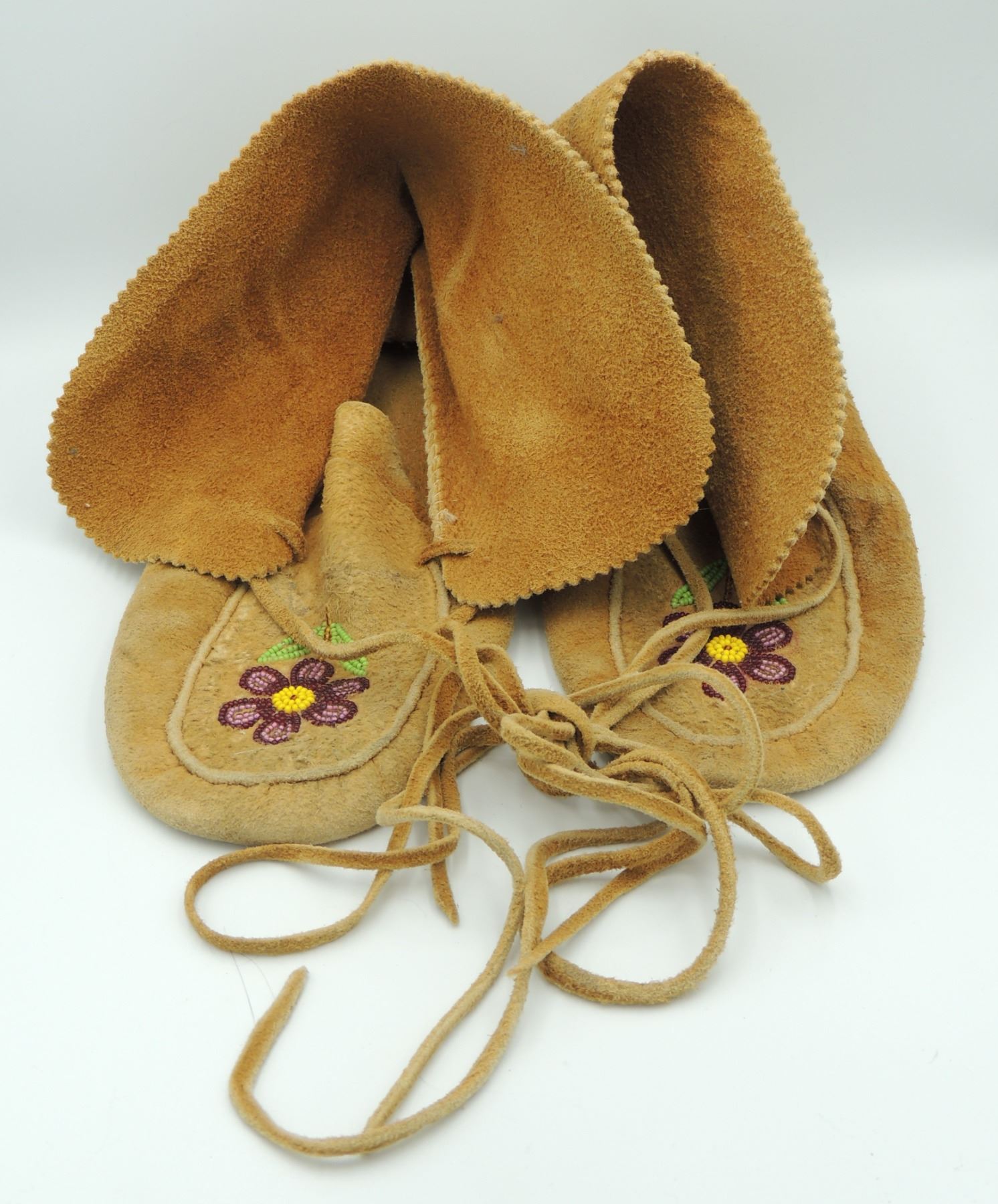 Moccasins Shoes are Constructed of skin with Floral Beadwork Pattern on foot. Measures 9.5 Inches Long, 4.5 Inches Wide and 4 Inches Tall. Please see our Other Auctions for additional - First Nations -Aboriginal -Indigenous Peoples - Métis- Metis - Iniut - Native American - Plains Indian - Artefacts