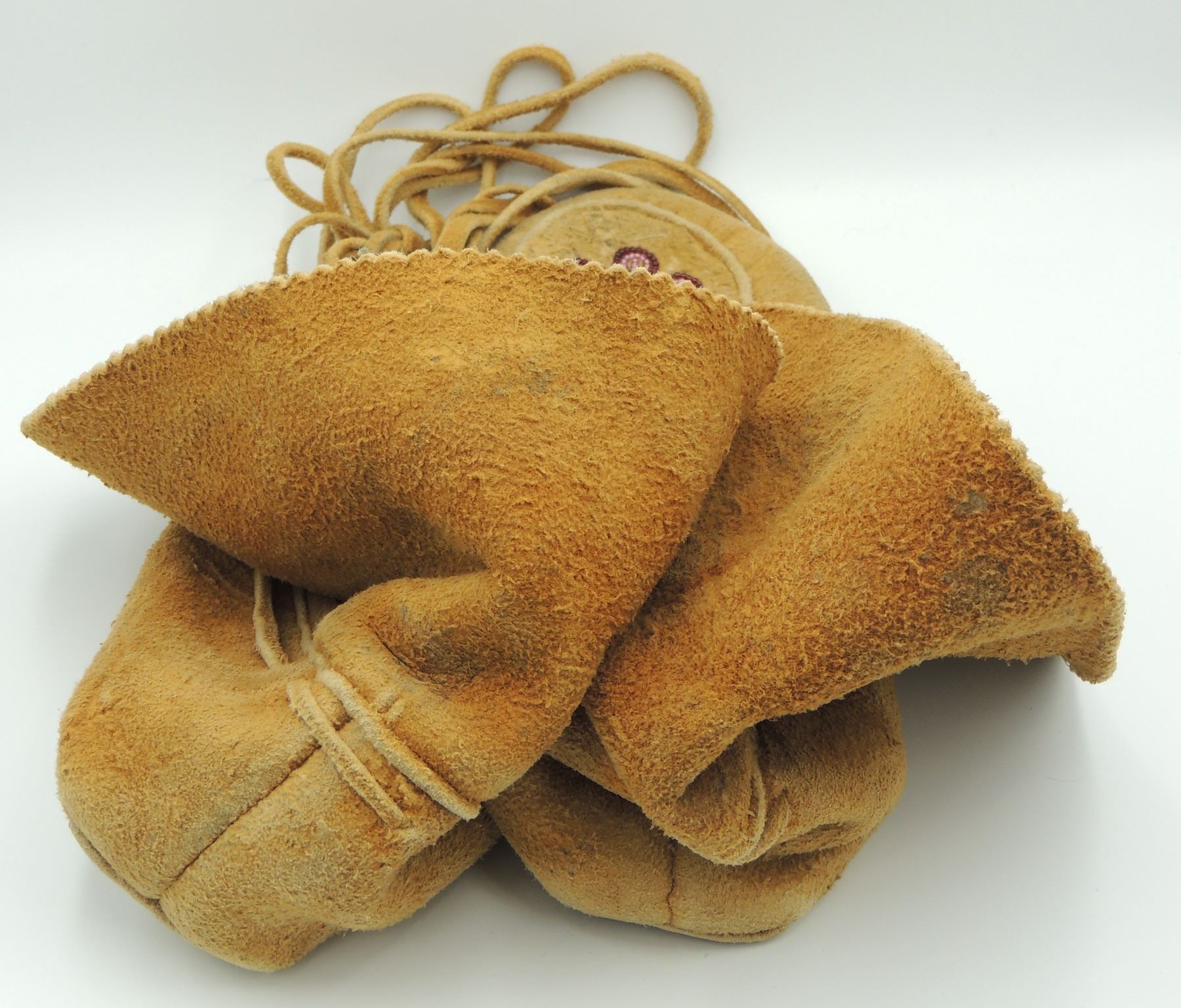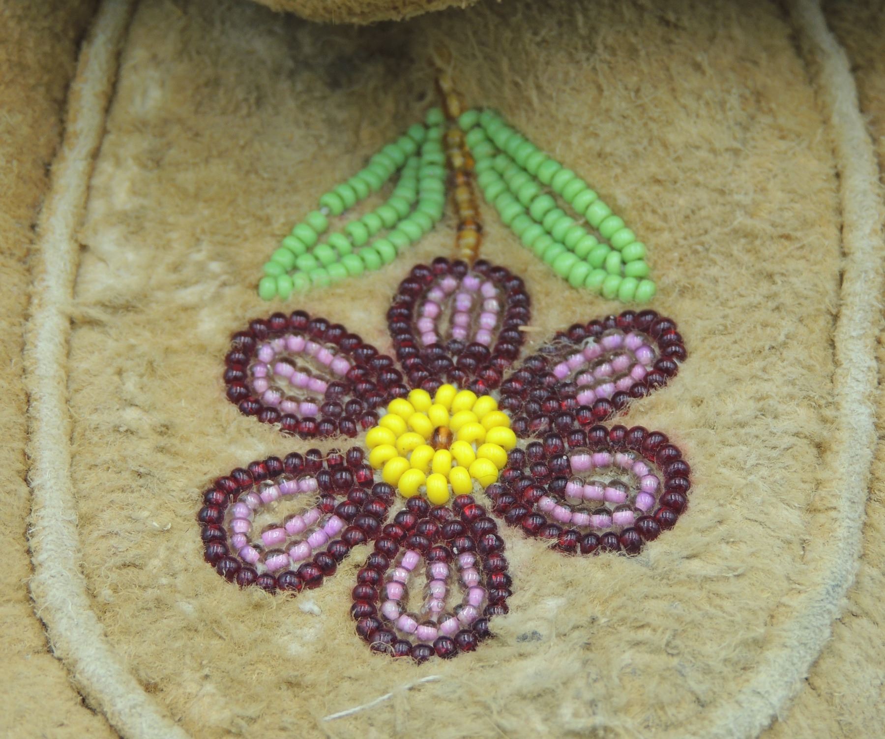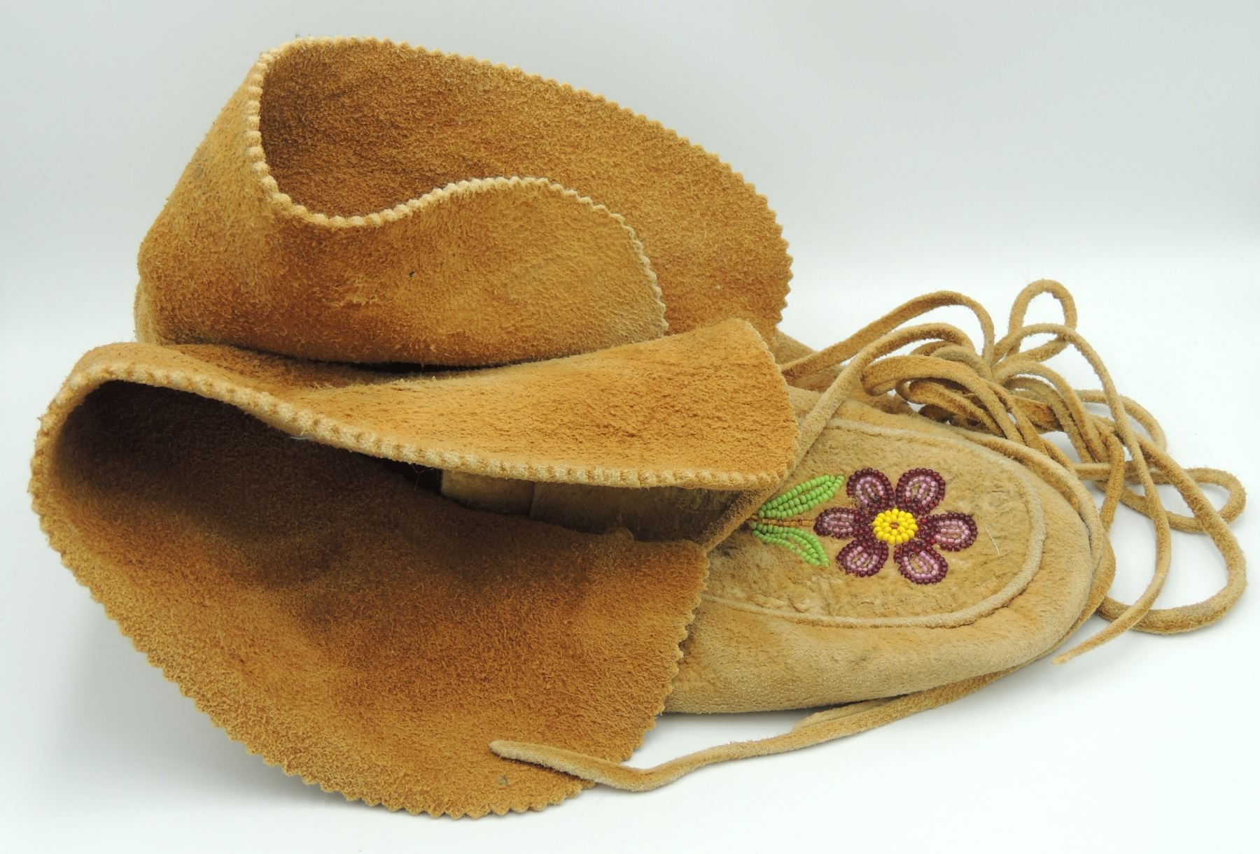 Moccasins Shoes are Constructed of skin with Floral Beadwork Pattern on foot. Measures 9.5 Inches Long, 4.5 Inches Wide and 4 Inches Tall. Please see our Other Auctions for additional - First Nations -Aboriginal -Indigenous Peoples - Métis- Metis - Iniut - Native American - Plains Indian - Artefacts