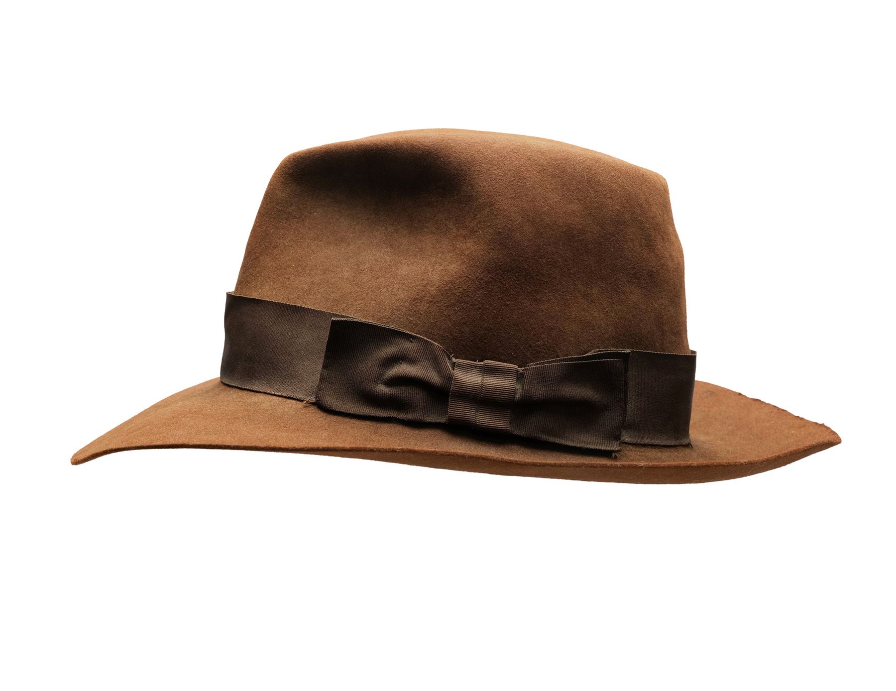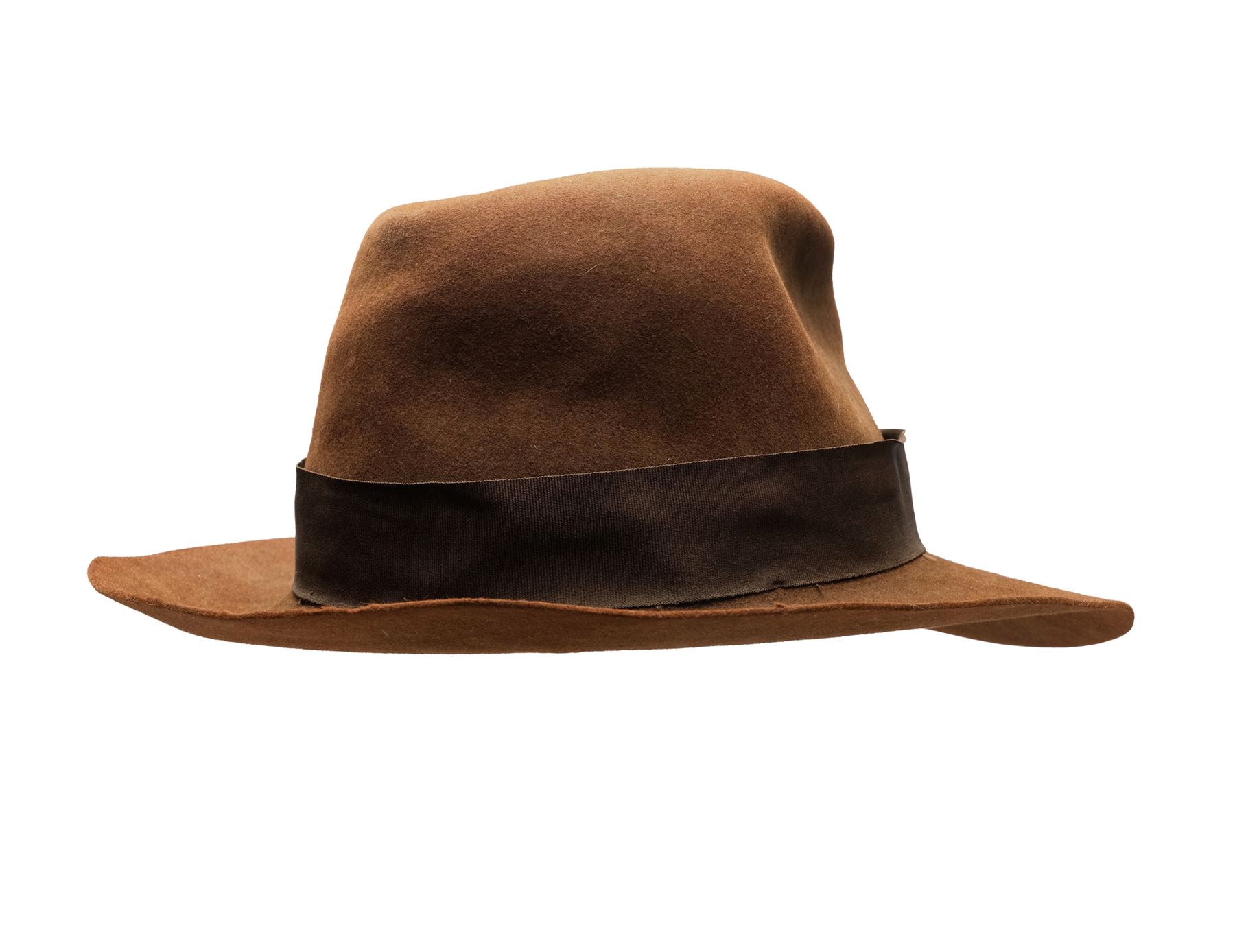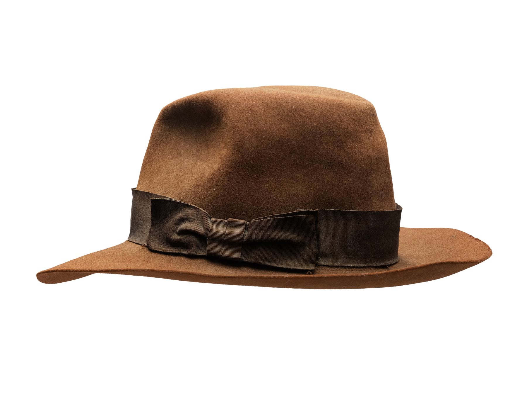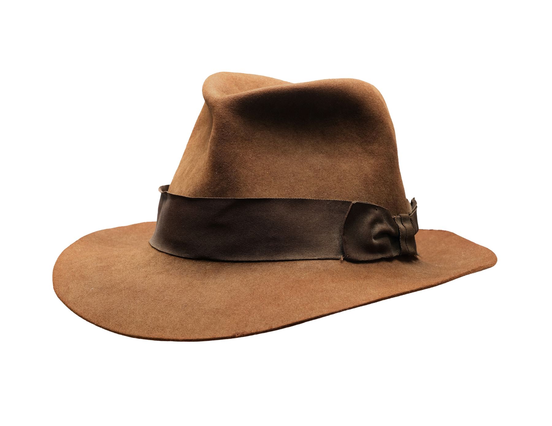 This fedora is in good condition, showing wear and evidence of use, along with aging. It exhibits minor loss to the rabbit felt on some areas of the hat's brim, though this does not detract from its presentation. This is one of the nicest examples of an original Indiana Jones fedora to come to public auction due to its direct provenance, signs of extensive use, and screen-matching to the film and production stills. Dimensions: 13" x 12" x 6" (33 cm x 30 cm x 15 cm)