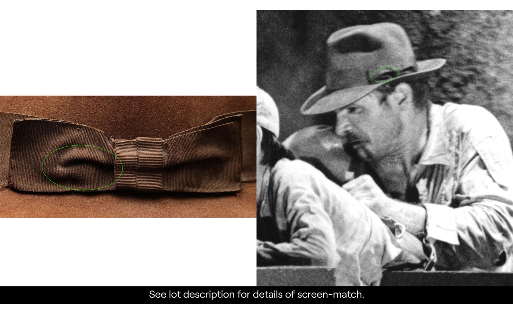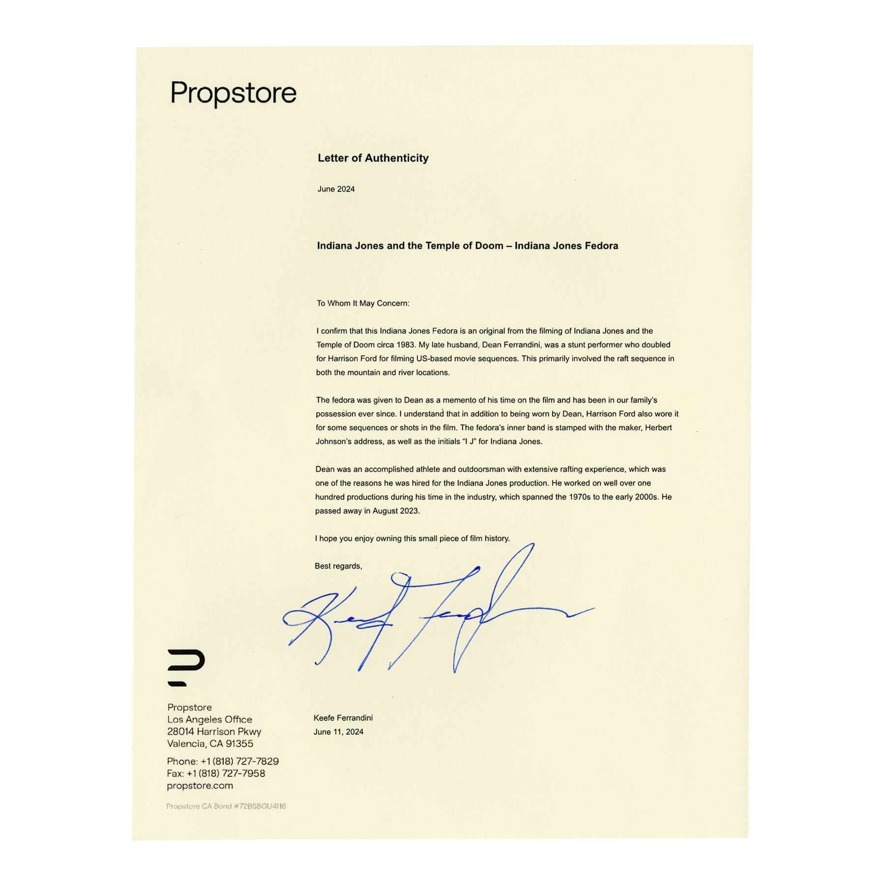 INDIANA JONES AND THE TEMPLE OF DOOM (1984) - Indiana Jones' (Harrison Ford) Screen-and-Photo-Matched Fedora Also Worn by Stunt Performer Dean Ferrandini - Indiana Jones' (Harrison Ford) screen-and-photo-matched fedora from Steven Spielberg's Indiana Jones and the Temple of Doom. As iconic as the character himself, the hat worn by Indiana Jones is the definitive element of his unforgettable outfit. This fedora was made specifically for the second installment of the Indiana Jones series and matches film shots, production stills, and behind-the-scenes footage of Ford in the village set on location in Sri Lanka, in the mine cart chase shot at Elstree Studios, and in the river sequence shot in the U.S. The hat was also worn by the late stunt performer Dean Ferrandini, who worked on the raft sequences in the US. It comes from Ferrandini's personal collection and is offered to the collector's market for the first time. Included with the fedora are previously unpublished photos of veteran stuntman Ferrandini in costume as Indiana Jones as well as a letter of authenticity signed by Dean Ferrandini's wife Keefe Ferrandini.