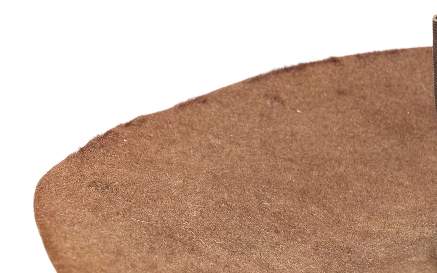 The fedora is made of sable-colored rabbit felt and features a dark brown ribbon and a leather sweatband imprinted with the Herbert Johnson Hat Company name and address, as well as a tag marked size 7 1/4 (size 59 European.) The sweatband is notably stamped with the initials "I J" in gold, a feature applied specifically to the hats Herbert Johnson made for the three original installments of the Indiana Jones saga. It also features some makeup residue at the front of the sweatband. The style, placement, and size of the markings are all consistent with other known authentic examples of Temple of Doom fedoras.