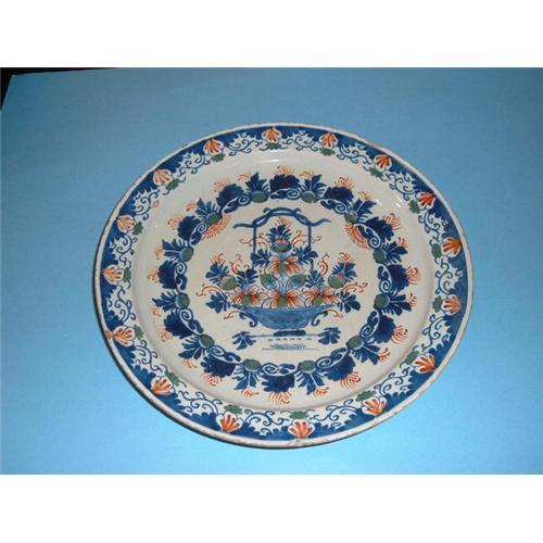 A wonderfully decorated delftware charger with floral polychrome decoration. The center of the charger has a basket with flowers. The colors are a burnt orange, dark blue and dark green. There is chipping along the rim of the charger ans some minor pitting. Photo of chipping included. 13 inch diameter.