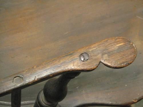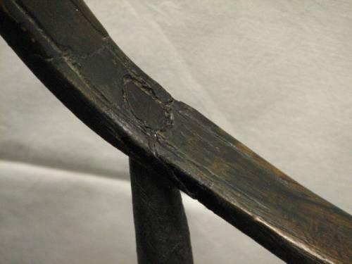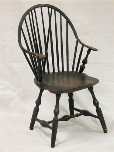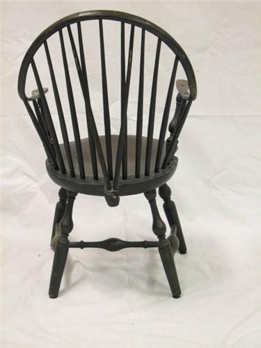 Circa 1730, Windsor continuous-arm chair. Features arched loop flowing into arm rests with shaped hand grips, 9 turned cylindrical spindles fitted into incised plank seat supported by baluster turned legs and stretchers retaining an old black painted surface. Early repair to left arm at the curve. Dimensions: 36"H x 20"W x 20.5"D.