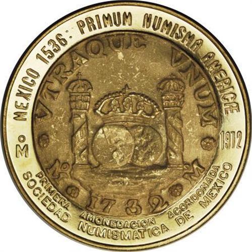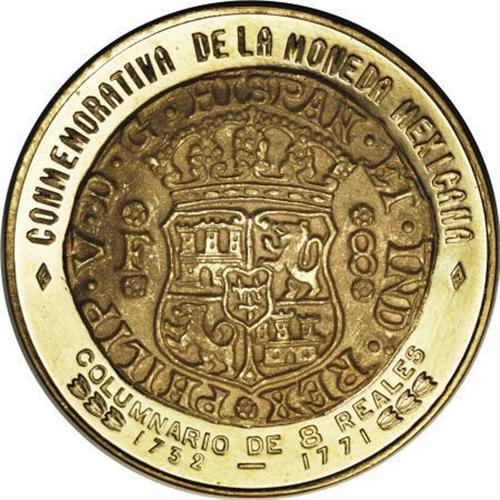 <B>1732-1972 Mexico City Mint Gold Commemorative Medal.</B></I> Gold, 38 mm, 41.5 gm. Struck at the Mexico City Mint in commemoration of the first eight reales coin struck. The total original mintage for this medal back in 1972 was a mere <B>100 pieces struck</B></I>. This was part of a series of gold medals produced for the anniversary of the mint. The current gold value is approximately $1,000.<BR><BR><b>Shipping:</b> Coins & Currency (<a target="_blank" href="http://www.heritageauctions.com/common/shipping.php">view shipping information</a>)