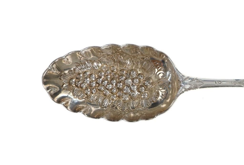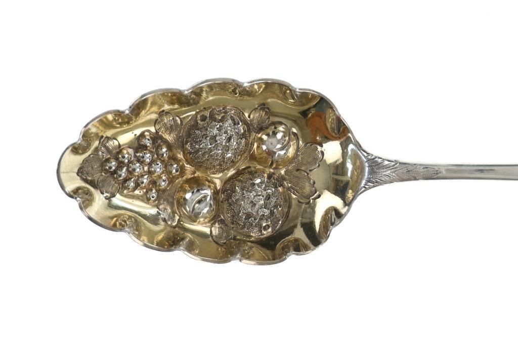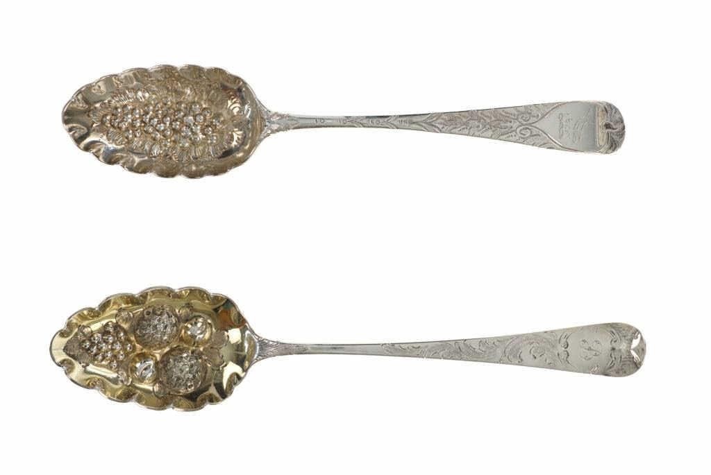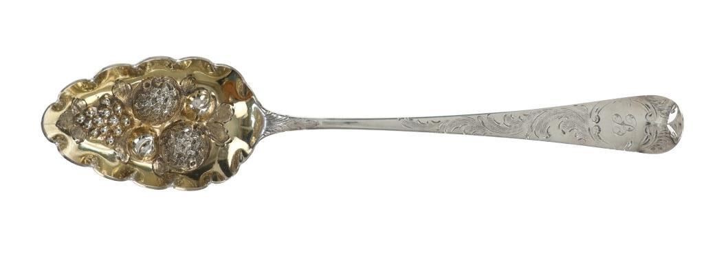 For your consideration are two sterling & gold washed serving spoons made in England circa 1736-1790. The first spoon was made by Thomas Northcote in 1736 in London. Between 1766 and 1771, Thomas Northcote, a skilled maker of spoons and forks, served as Charles Hutton's apprentice. On August 20, 1776, he entered his first mark (TN), having spent five years working in Thomas Chawner's workshops. He briefly collaborated with George Bourne (TN/GB) during the middle of the eighteenth century before returning to working for himself. He was an expert in this craft as he is particularly remembered for the fine quality forks that bear his mark. He died in 1798 aged forty nine leaving his widow, Hannah, to continue the business. The spoon shows intricate designs and detail with stampings on the bottom of the neck. The stampings show the makers hallmark "TN", the lion passant showing the quality of the silver, the London town mark, and an "A" indicating the year it was made (1736). The bowl of the spoon is highly decorated with a floral and fruit design that has been gold washed. The spoon measures 8 1/4" L x 1 11/16" W x 7/8" H. The second spoon in this collection was made by Peter & Ann Bateman in London in 1790. Peter and John Bateman, the sons of Hester Bateman, registered their mark in 1790. This partnership only lasted a short time because Jonathan, who wed Ann Downlinff, passed away in 1791. The mark was changed to Peter and Ann Bateman in 1791. The trademark of Peter Bateman, Ann Bateman, and William (I) Bateman was registered in 1800. Jonathan and Ann Bateman's son, William, entered a partnership with his uncle Peter and his mother Ann in 1800. After Ann retired in 1805, Peter and William (I) Bateman's new mark was registered.