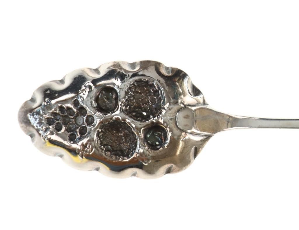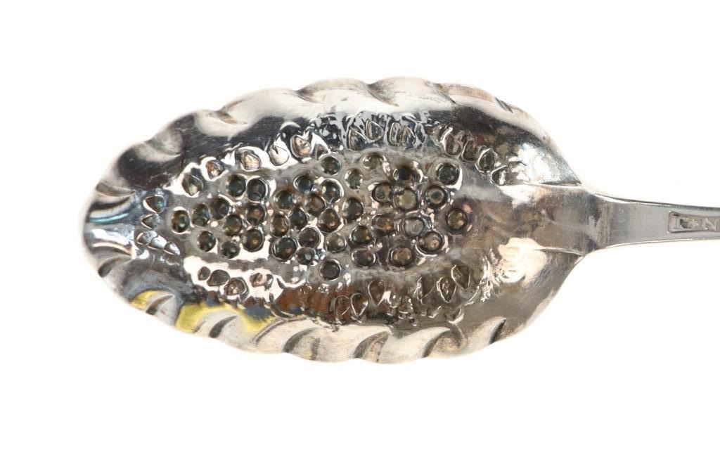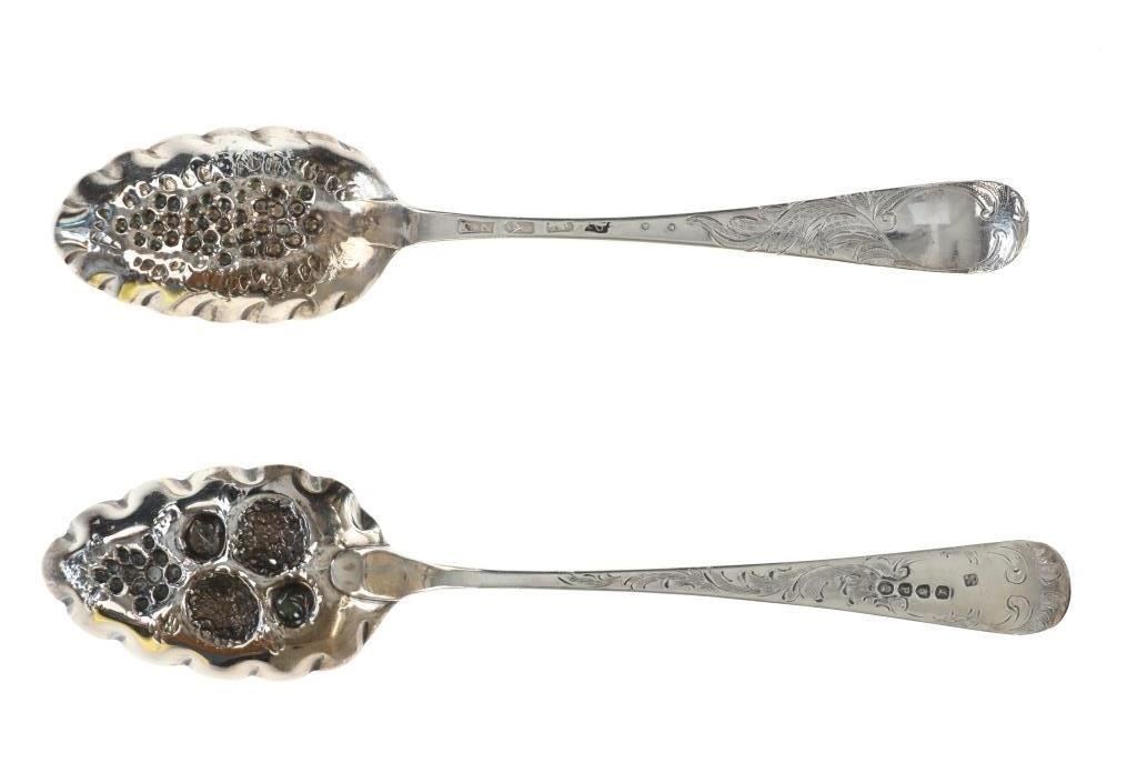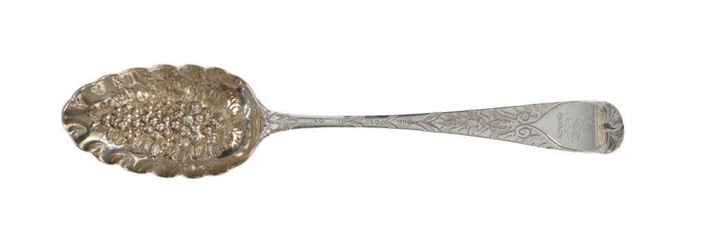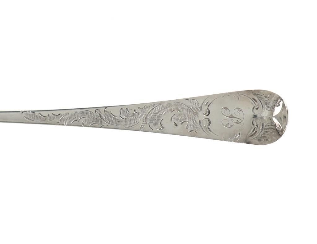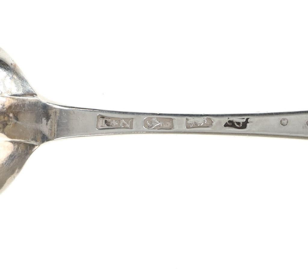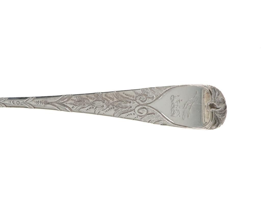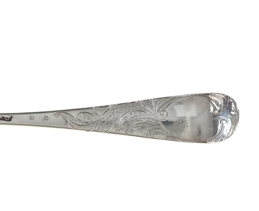 The spoon is highly decorated on the handle and bowl and shows stampings on the bottom of the neck. The stampings show the makers hallmark "PB/AB", the lion passant mark certifying the quality of the silver, the London town mark, a right facing kings head showing it was made during George III rule, and a letter "P" indicating the year it was made (1790). This spoon also features a gold washed bowl giving it a golden hue. The spoon shows good condition overall with a light patina from its antique age and a small hole in the bowl of the spoon, but no other signs of damage are present. The spoon measures 8 3/4" L x 1 7/8" W x 1 1/8" H. The collective weight of the two spoons is 132.1 grams.