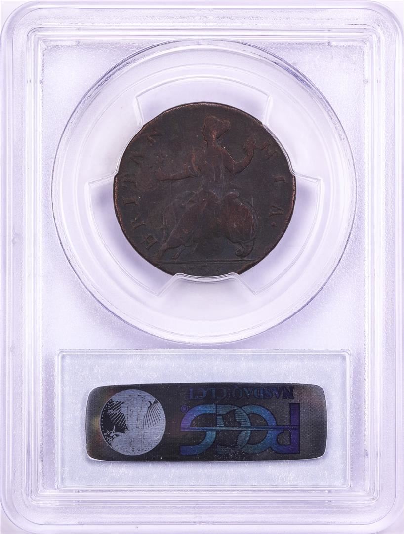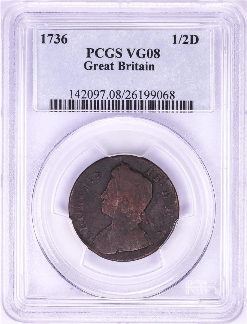 One 1736 Great Britain 1/2 Penny Coin PCGS VG08. PCGS Graded.