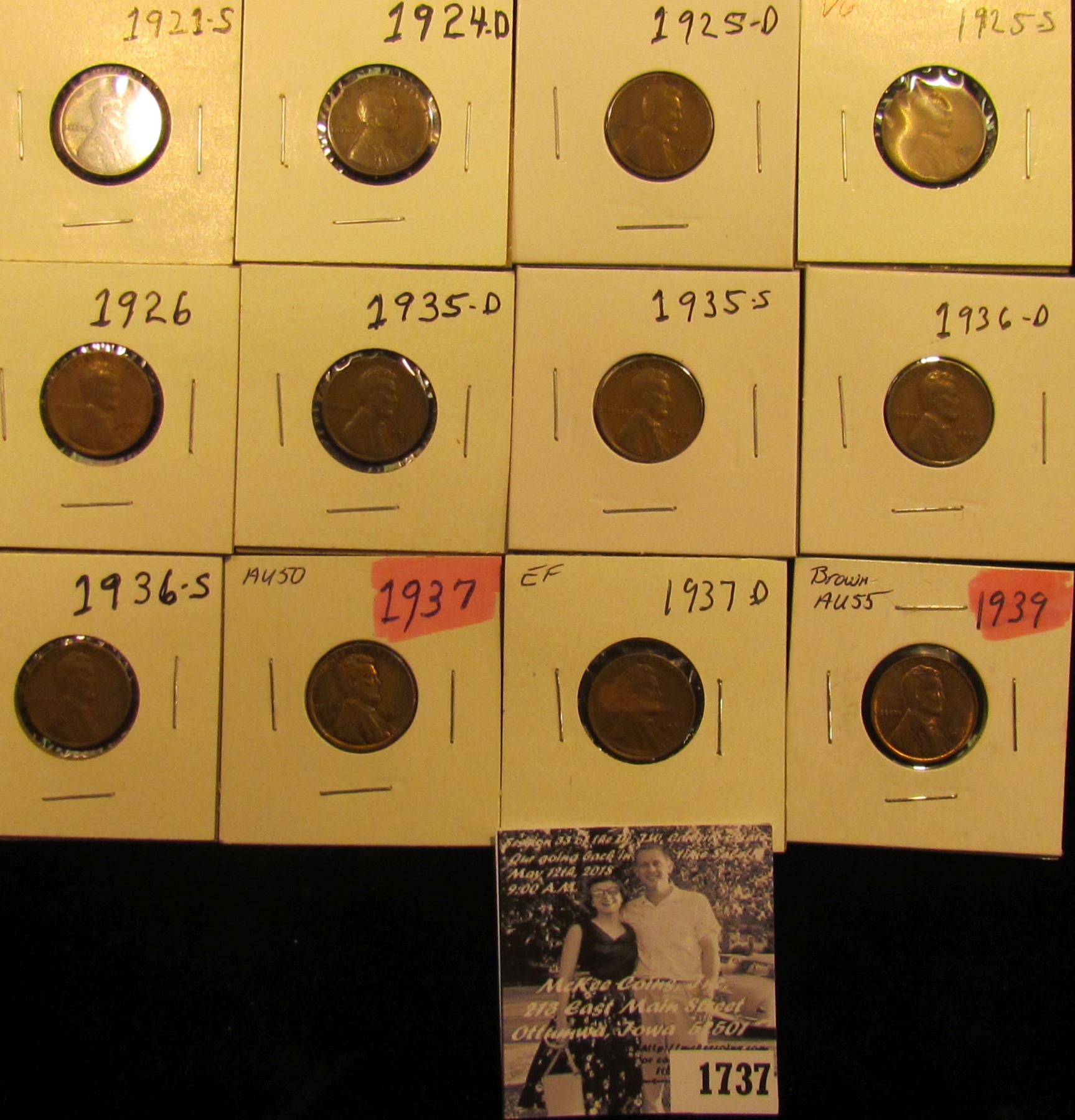 1737 . 1921S Fine, 24D Fine, 25D Good, S VG, 26P VG, 35D Fine, S VG, 36D VG, S Fine, 37P AU, D EF, & 39P AU Lincoln Cents.