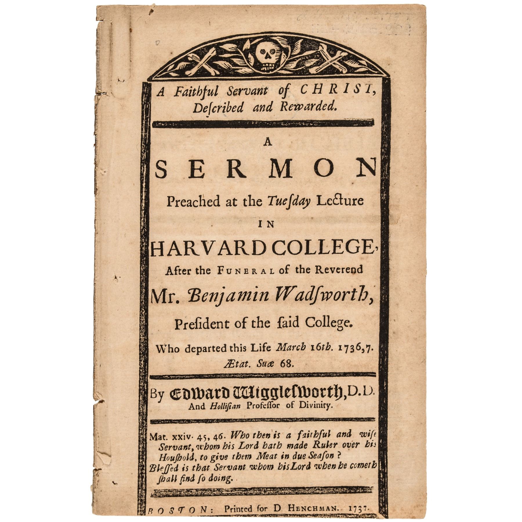 Important 1737 Harvard College Printed Sermon fully titled, "A Sermon Preached at the Tuesday Lecture in Harvard College After the Funeral of the Reverend Mr. Benjamin Wadsworth, President of the Said College. Who departed this Life March 16th. 1736,7. By Edward Wigglesworth, D.D. And Hollistan Professor of Divinity. Boston, Printed for D Henchman. 1737”. This historic Imprint is ex: Harvard College Library, deaccessioned having its blindstamp on the inside cover page. It measures 4.5 x 7 inches, and contains 18 pages plus Cover. The vivid bold black printed cover design with the wonderful “Skull” within the ornate top and is clean throughout, with just some separation at the lower spine. Wadsworth was President of Harvard College from 1725 to 1737. In fact, the second oldest building at Harvard is named after him in 1726 the “Wadsworth House,” which also became known as the “President's House”. He was supposedly not a very strict disciplinarian, so there was much student drinking and pranks during his tenure. Wigglesworth (1693 - 1765) was the first Divinity Professor at Harvard under the Hollis Chair, and his tenure ran from 1722 to 1745. He was the first Divinity professor to teach at any American college. A wonderful rarity and historic item that is choice in eye appeal for display. Truly a specially great find for any Harvard Alumnus’ collection.