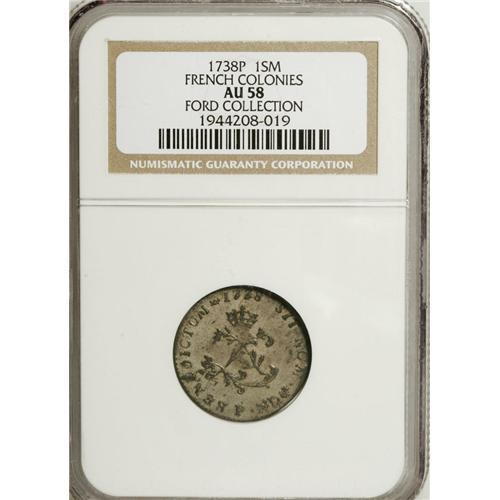 <B>1738-P SOU M French Colonies Sou Marque AU58 NGC.</B></I> Ex: Ford Collection. Breen-537. Vlack-161a, no stop before SIT. The obverse is predominantly silvered, the reverse has about half of its initial silvering, and with areas of deep dove-gray toning. Listed on page 51 of the 2007 <I>Guide Book.</B></I><BR><I>Ex: John J. Ford, Jr. Collection, Part 13 (Stack's, 1/06), lot 209.</B></I><BR><BR><b>Shipping:</b> Coins & Currency (<a target="_blank" href="http://www.heritageauctions.com/common/shipping.php">view shipping information</a>)