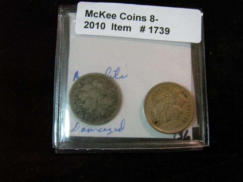 1739. 1872 & 1881 Three Cent Nickels. Both damaged.