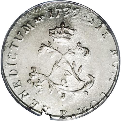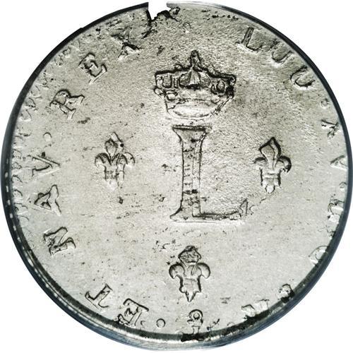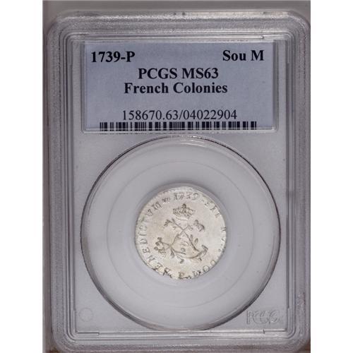 <B>1739-P<img border='0' src='http://www.heritagecoins.com/images/star.gif' width=10 height=10>OU M French Colonies Sou Marque MS63 PCGS.</B></I> Breen-539. An unmarked example with light olive-tan toning across the otherwise slate-gray surfaces. A few minor laminations, as made, are seen on the central obverse. Double struck in the collar with marginal rotation of the piece relative to the dies between strikes. Evidence of the double strike is seen on the right side of the crown and opposite on the right side of the left fleur de lis. A moderate-sized planchet flaw on the reverse at 6:30 affects the B in BENEDICTUM. Population: 1 in 63, 0 finer (12/05). Listed on page 51 of the 2006 <I>Guide Book.</B></I>