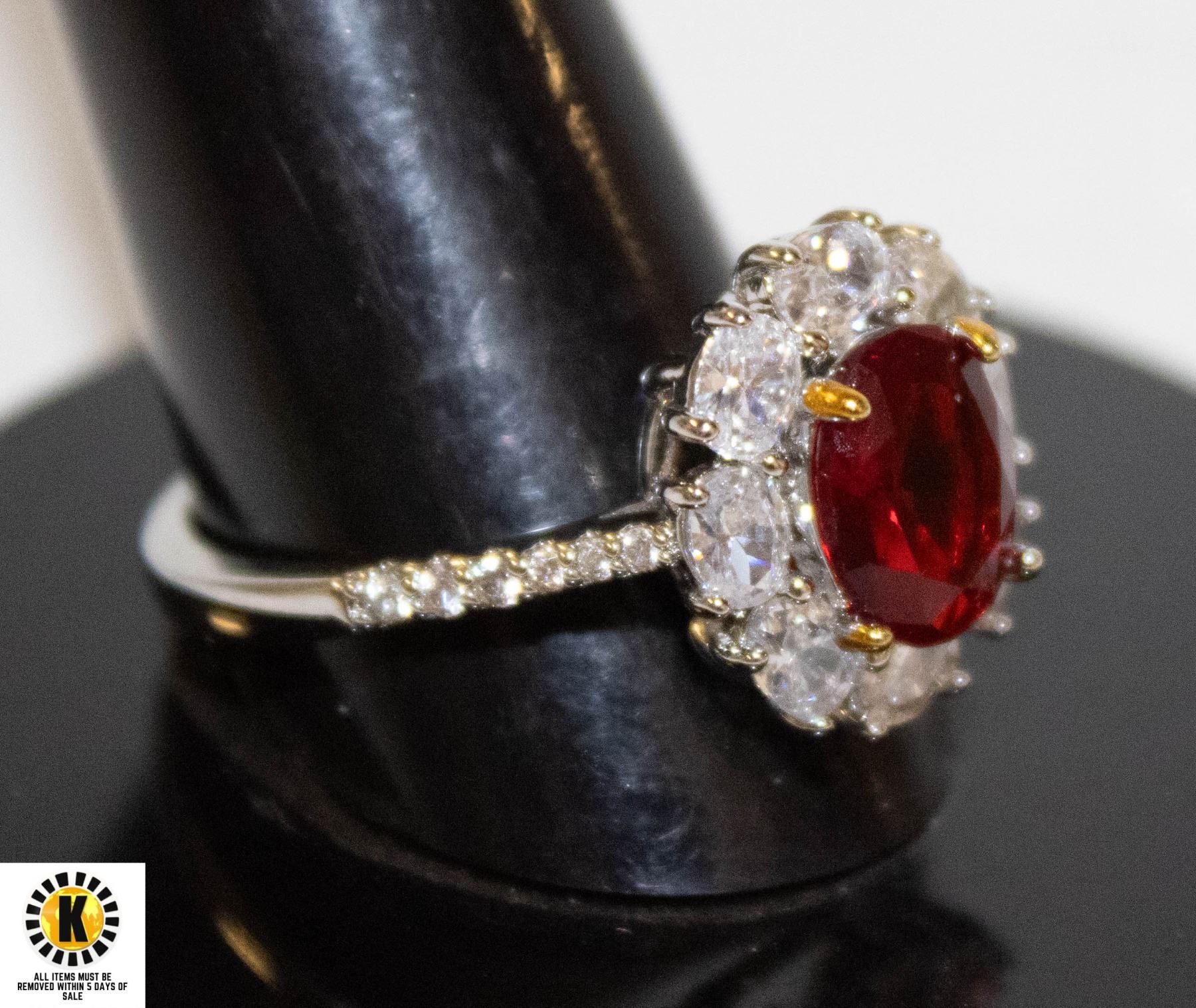 CLEAR STONES IN HALO DESIGN WITH CLEAR STONES IN SHANK OF RING SIZE 9.5