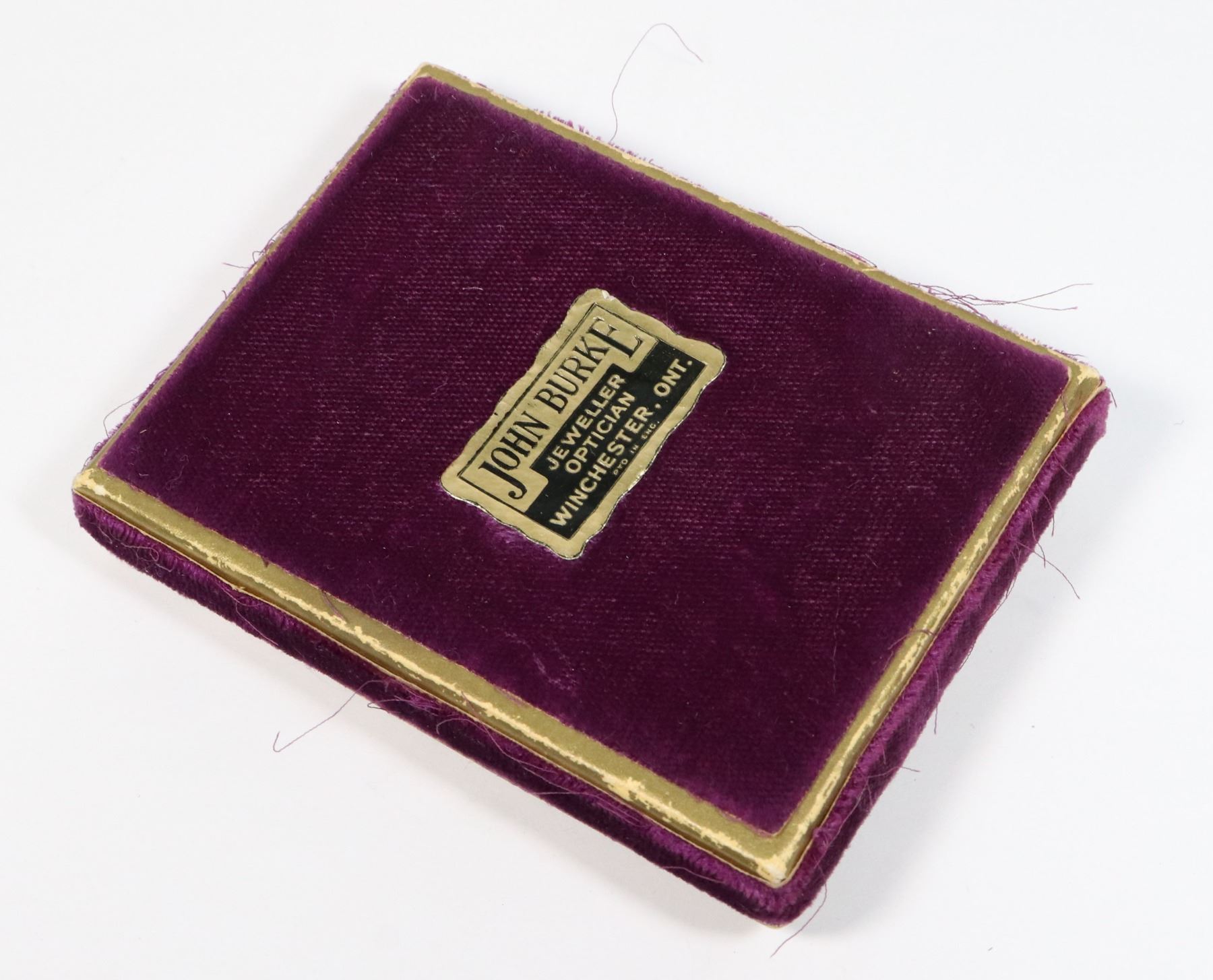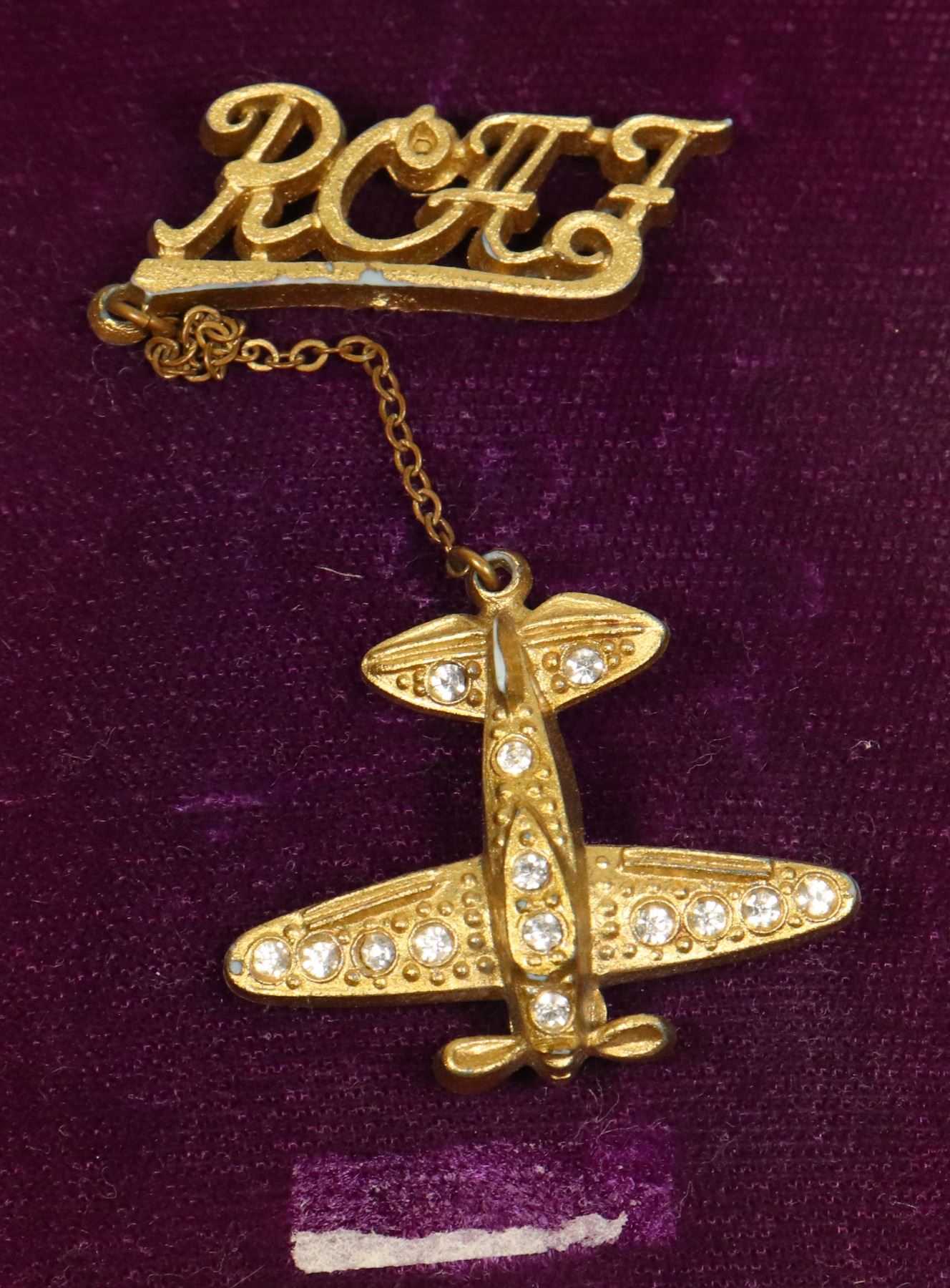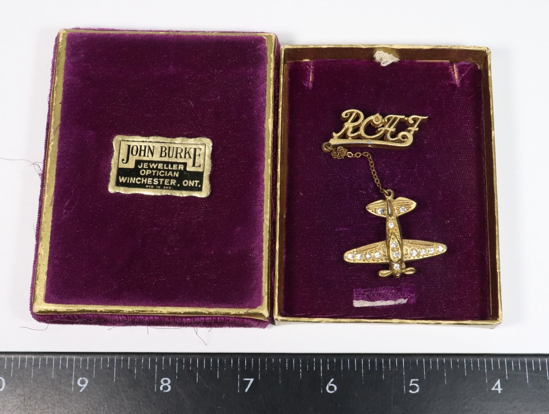 IN JOHN BURKE WINCHESTER ONTARIO JEWELRY BOX EARLY PLASTIC SWEETHEART RCAF PIN ON CHAIN WORLD WAR TWO ERA CANADA CANADIAN ALLIED FORCES INSIGNIA HOMEFRONT