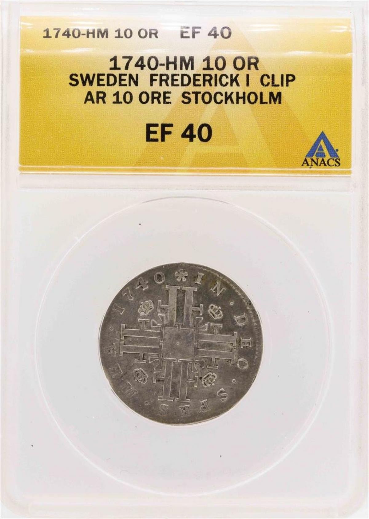 One 1740-HM Sweden Frederick I Clip AR 10 Ore Stockholm Coin ANACS XF40. ANACS Appraised.