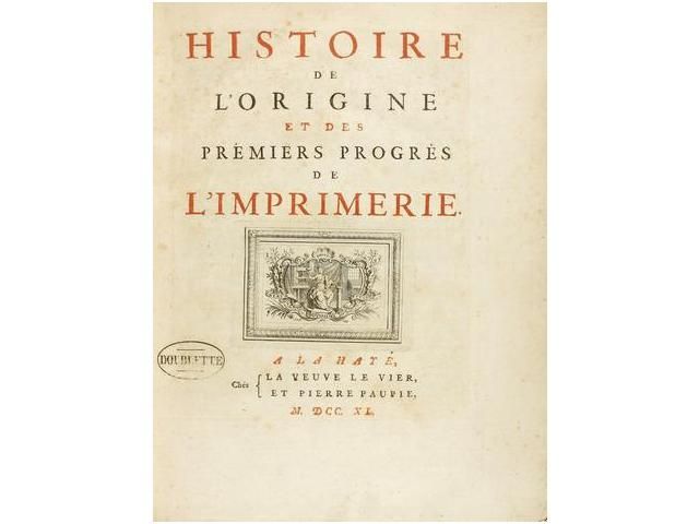 1740. LIBRO: (IMPRENTA). MARCHAND, PROSPER: HISTOIRE DE L´ORIGINE ET DES PREMIERS PROGRES DE L´IMPRIMERIE. La Haye: ches le veuve le Vier et Pierre Paupie, 1740. 2 tomos en 1 vol. en 4º mayor. I: XII + 118 p.; II: 152 p. Frontis grabado al cobre de J.V. Schley. Portada del vol. I a dos tintas. Enc. en plena piel, tejuelo. En la primera parte de tratan los progresos de la imprenta hasta 1500, en la segunda se presentan piezas importantes para su confirmación.