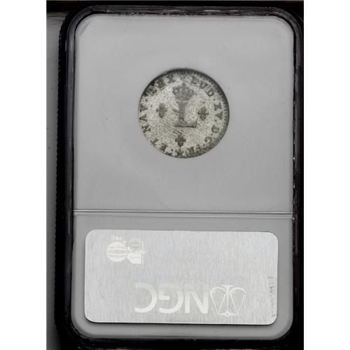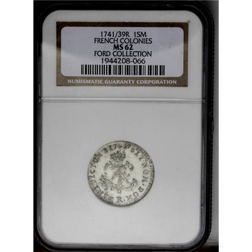 <B>1741/39-R<img border='0' src='http://www.heritagecoins.com/images/star.gif' width=10 height=10>OU M> French Colonies Sou Marque MS62 NGC.</B></I> Vlack-178a, R.7. Breen-553, "Extremely rare." The top crossbar of the underdigit 3 is obvious near the peak of the 4. A satiny silver-gray piece with no relevant post-strike marks, although portions of the centers and borders display roughness from the planchet. Listed on page 51 of the 2007 <I>Guide Book.</B></I><BR><I>Ex: M. Bertaud, 10/89; John J. Ford, Jr. Collection, Part 14 (Stack's, 1/06), lot 215.</B></I>